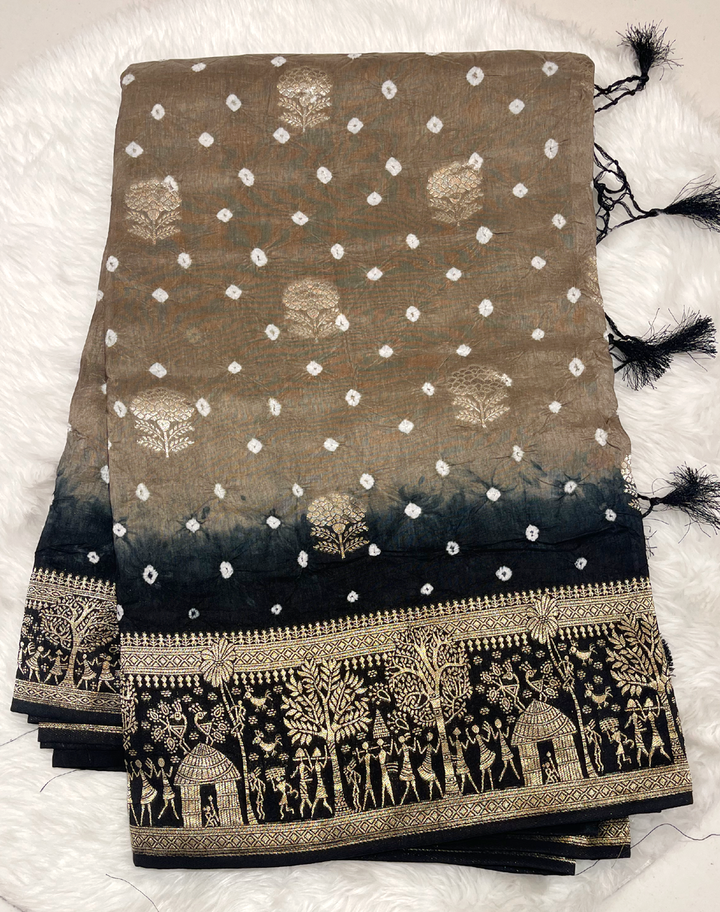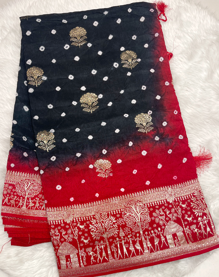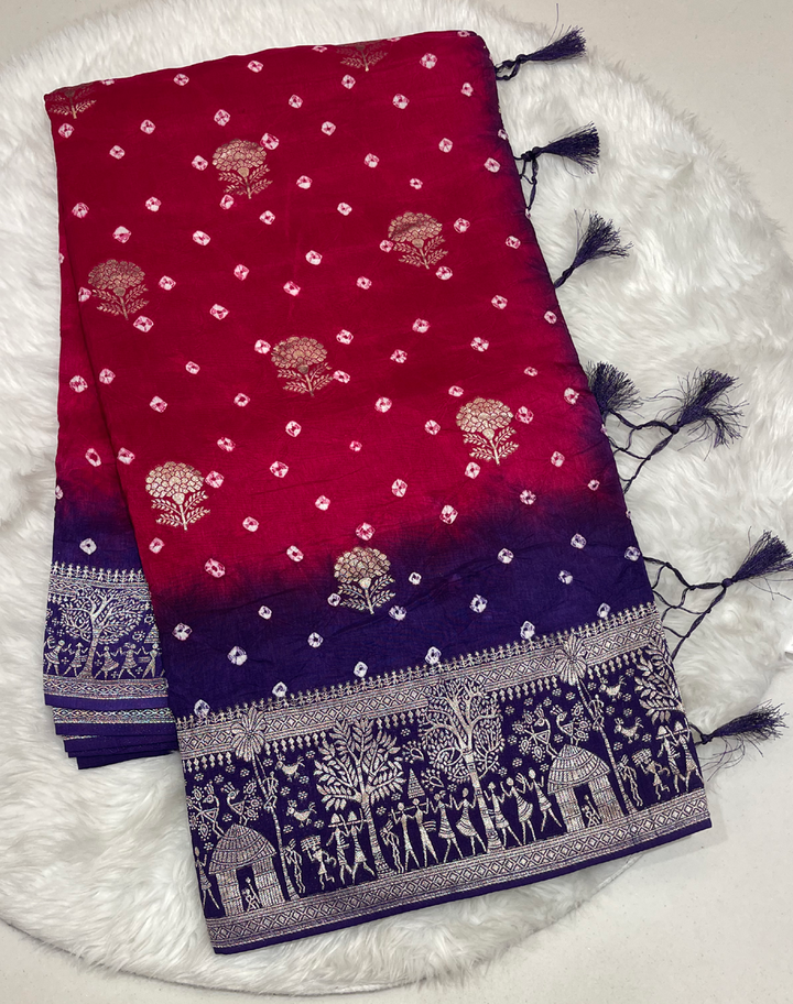 Gorgeous Banarasi Bandhani Saree in a striking purple and magenta ombré. Features traditional Bandhani work with an ornate Jamdani Border depicting figures and trees. Paired with a stylish Contrast Blouse. Perfect ethnic wear for weddings & festivals