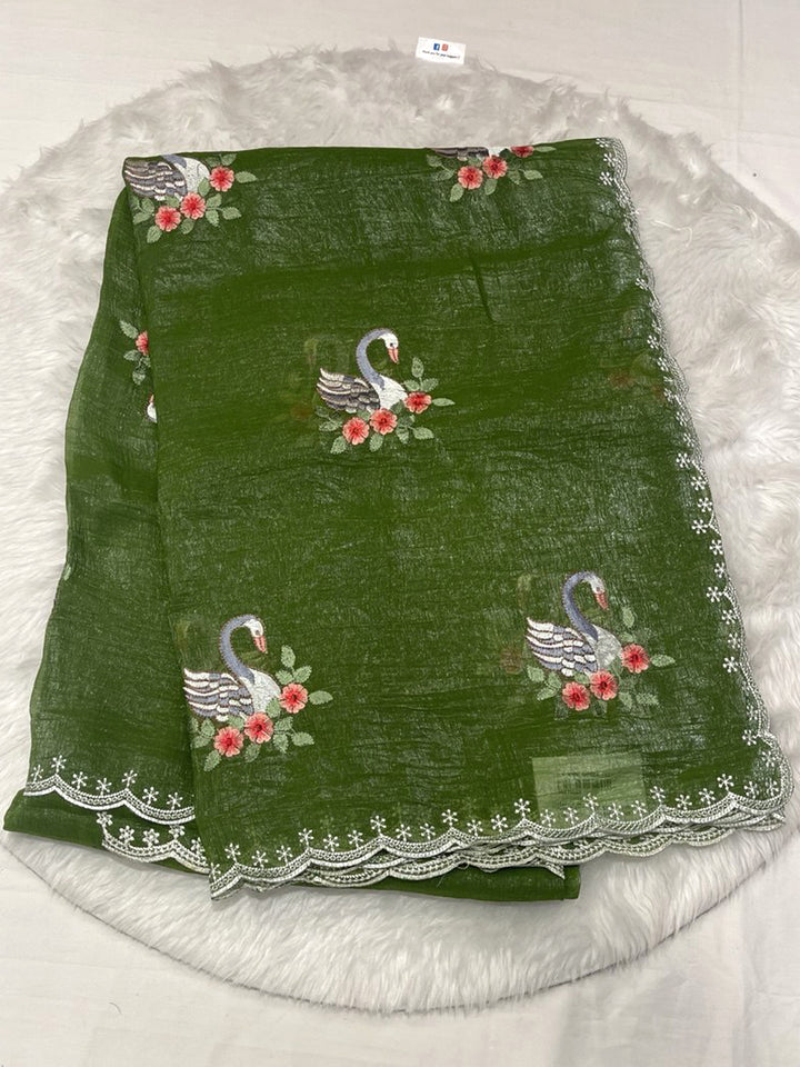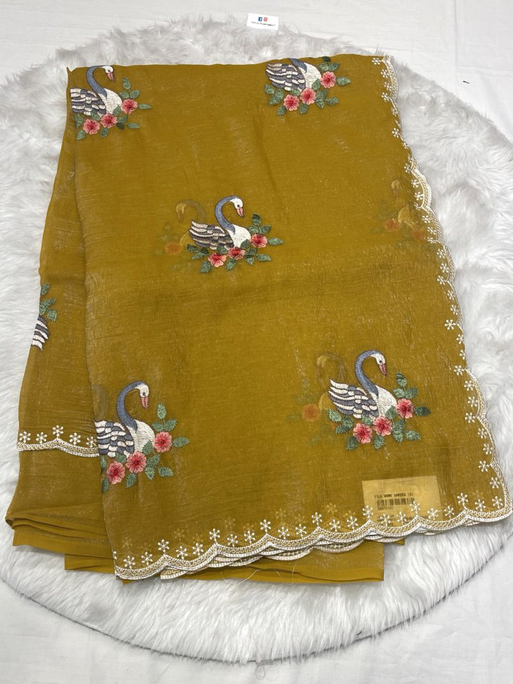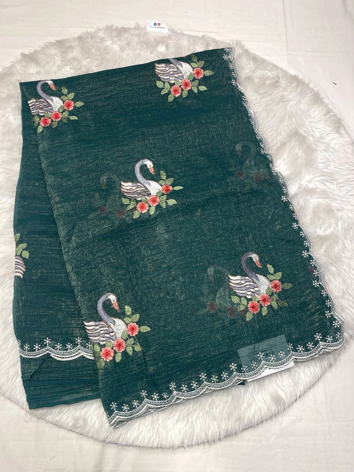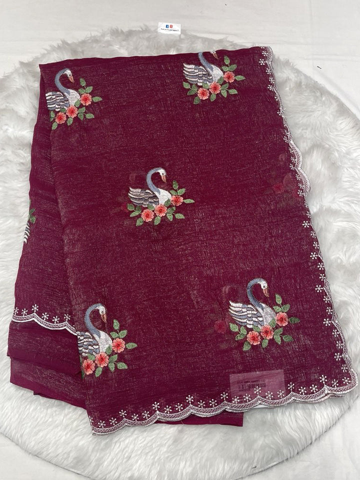 An elegant Barfi Silk saree in a rich dark chocolate/black shade, featuring a subtle self-design texture. The saree is beautifully adorned with intricate multicolor thread work embroidery, showcasing large, picturesque white swan motifs nestled among pink and red flowers. The edge is finished with a delicate scalloped lace border with fine thread work. Includes a matching running blouse piece (with border thread work detail).