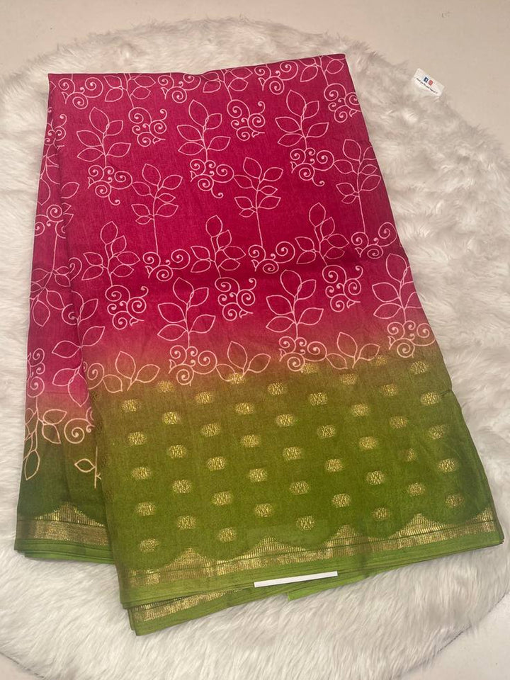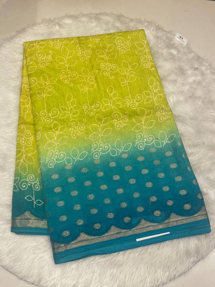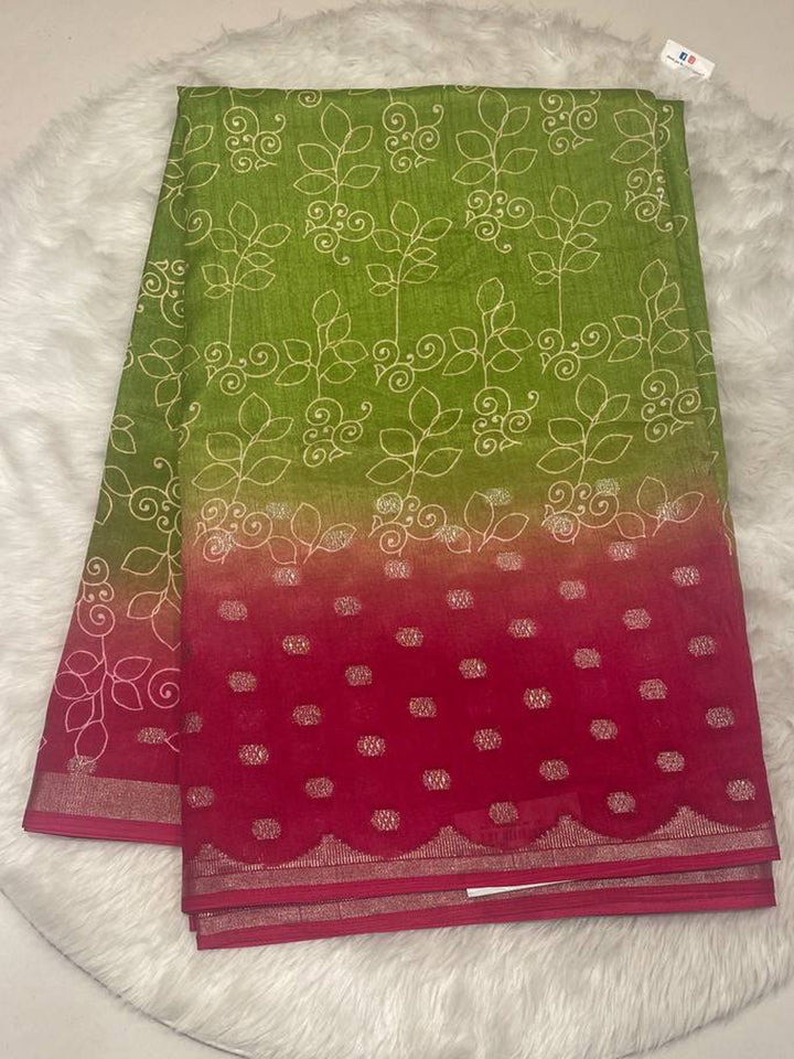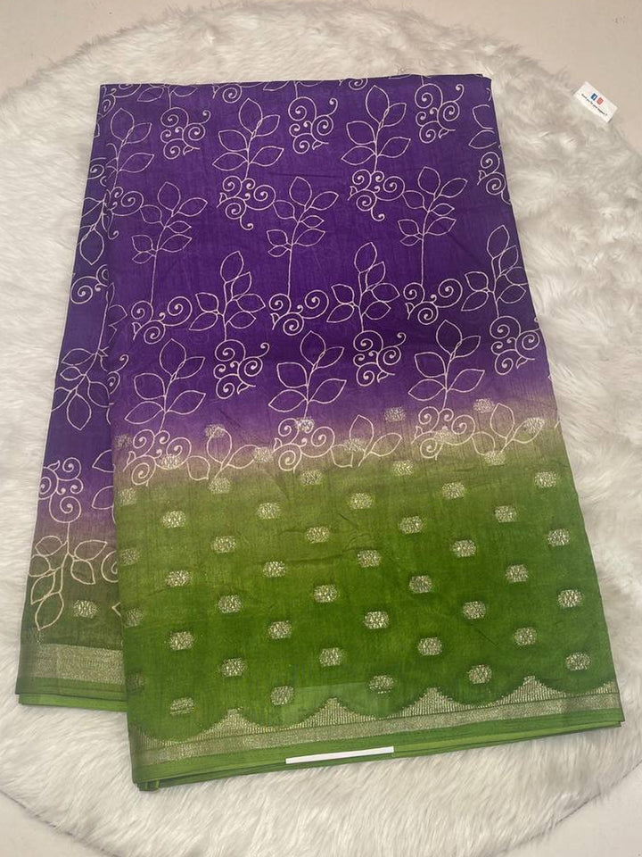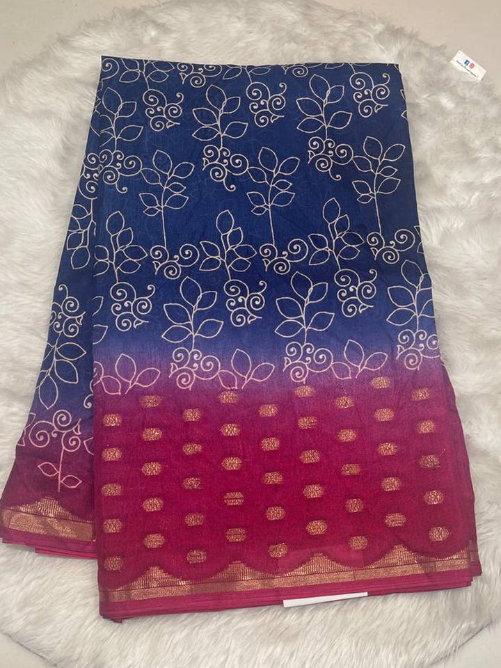 This Bhagalpuri silk blend saree showcases a stunning ombré effect, transitioning smoothly from vibrant orange-red to deep navy blue. The upper half features delicate white thread work with intricate vine and leaf motifs, adding elegance and texture. The contrasting lower half is enriched by woven gold butas and a scalloped design accentuating the thin gold zari border. A matching contrast blouse piece completes the ensemble, offering a refined and timeless look suitable for special occasions.
