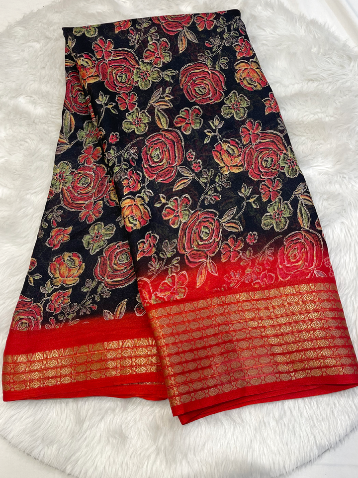 Unveil elegance with this Blossom Silk Saree! Its deep Navy Blue body is adorned with intricate multi-color floral prints, highlighted by a vibrant Rani Pink border with classic gold zari weaving. A perfect blend of modern charm and traditional grace. Comes with a matching self blouse.