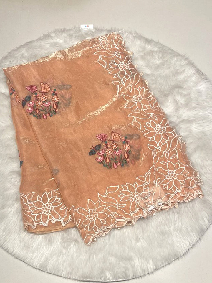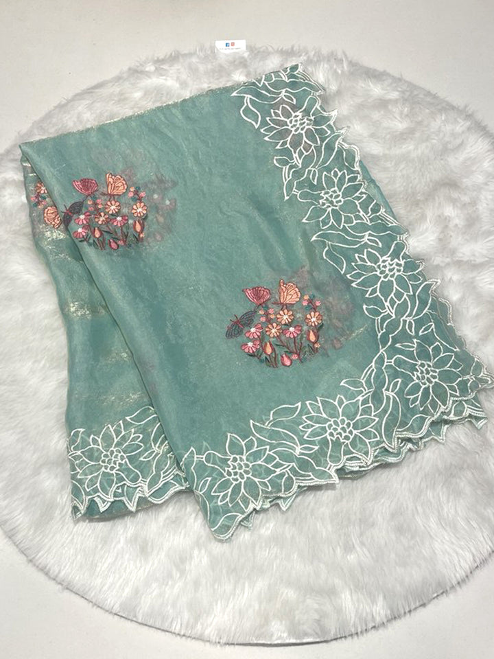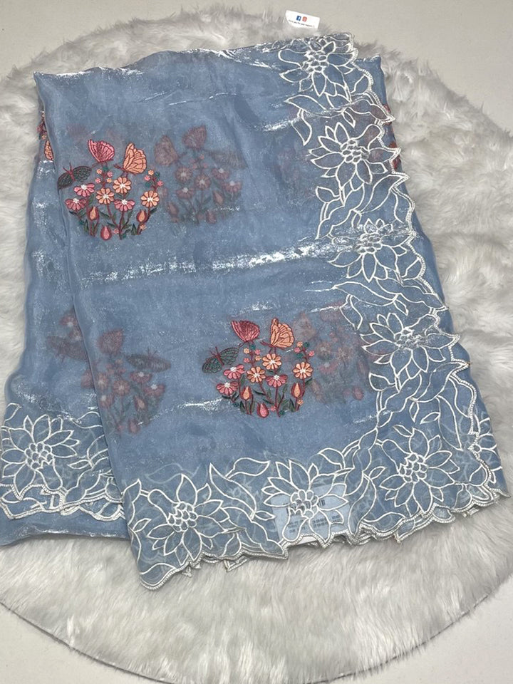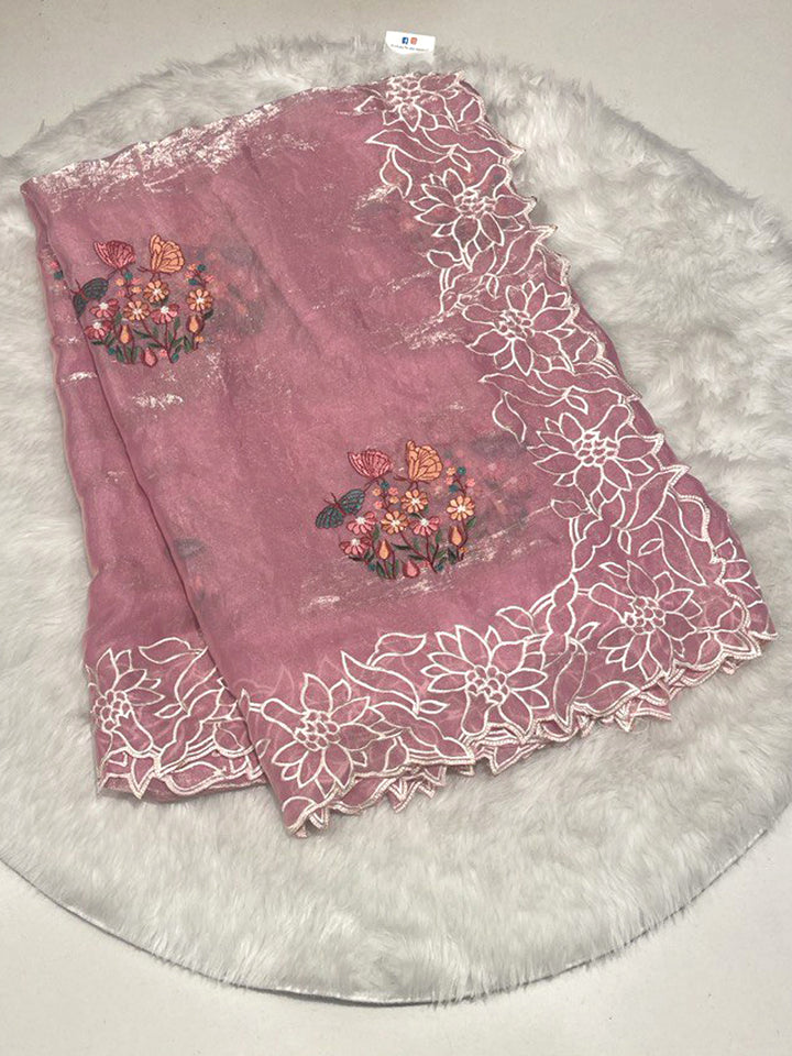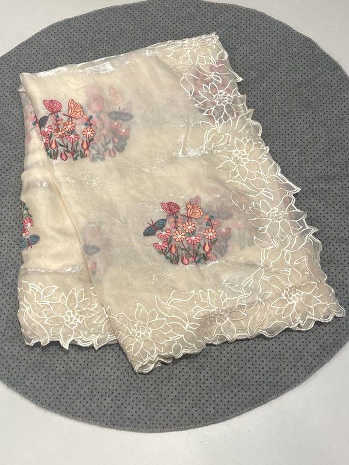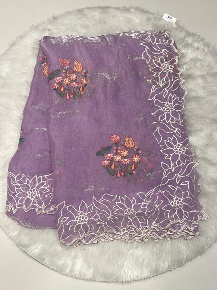 An enchanting Space Silk saree in a soft lavender/lilac shade, known for its light, ethereal drape and subtle texture. The body is adorned with gorgeous, scattered multi-color thread embroidery clusters featuring butterflies and small flowers (pink, red, green). The look is completed with a heavy, stunning scalloped cut-work border outlined in intricate white thread work. Includes a matching self-blouse piece.