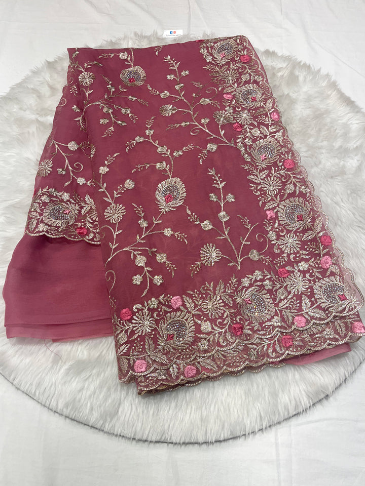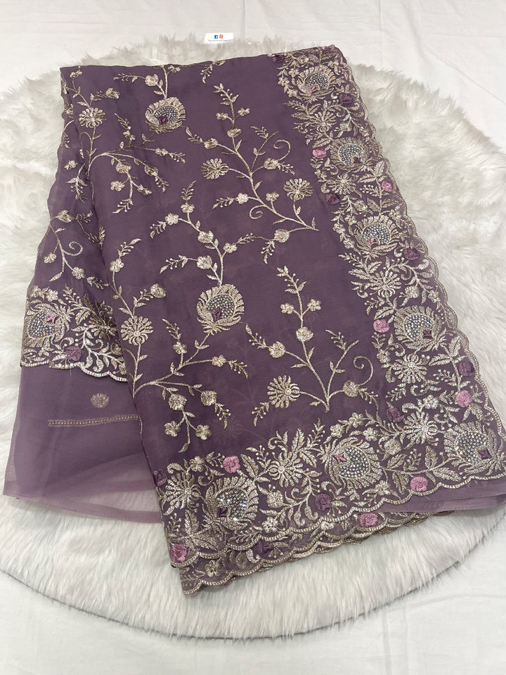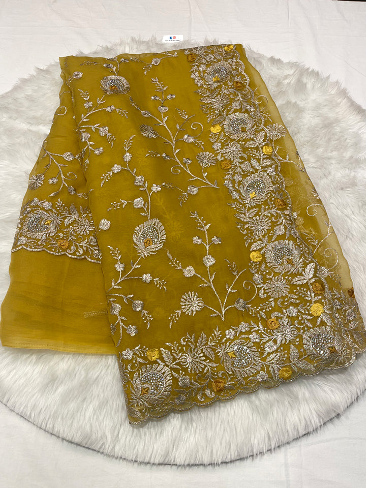 Embrace grandeur with this gorgeous Mustard Yellow Chiffon saree. It features exquisite, heavy jewellery work (intricate silver and gold thread/sequin embroidery) all over the body, and a dazzling cut-work border. The sheer, opulent texture makes it perfect for weddings or grand parties. It comes with a matching self-work blouse piece. Dry clean only.