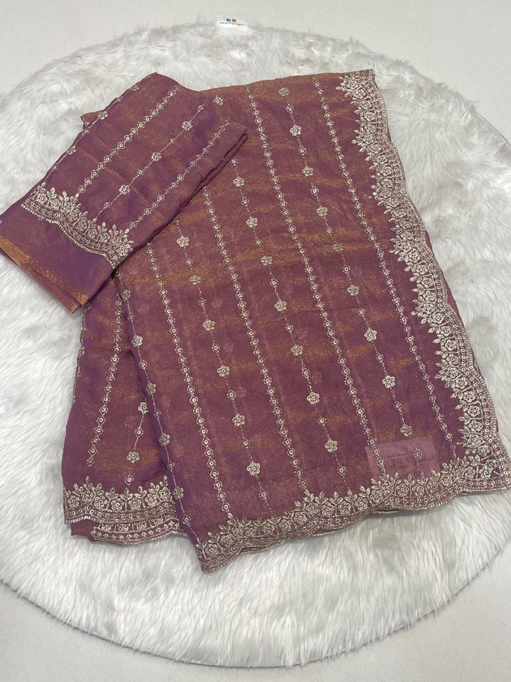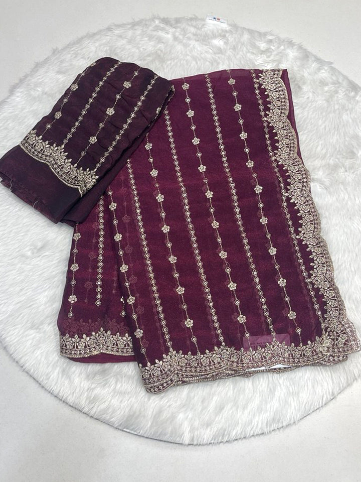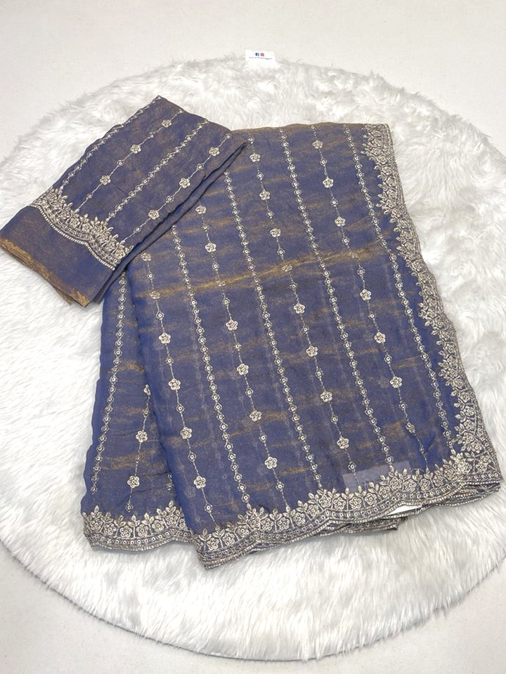 This striking Space Silk Saree in a vibrant Teal Blue offers a luxurious feel and fluid drape. The body features elegant vertical Zari stripes interspersed with delicate floral motifs. The saree is highlighted by an ornate, heavy Zari cut-work border running along the edges. It comes complete with a matching self-blouse piece featuring complementary Zari work, making it a spectacular and cohesive ensemble for any grand occasion.