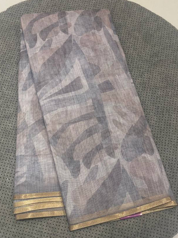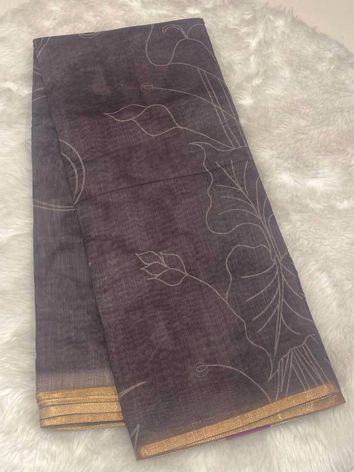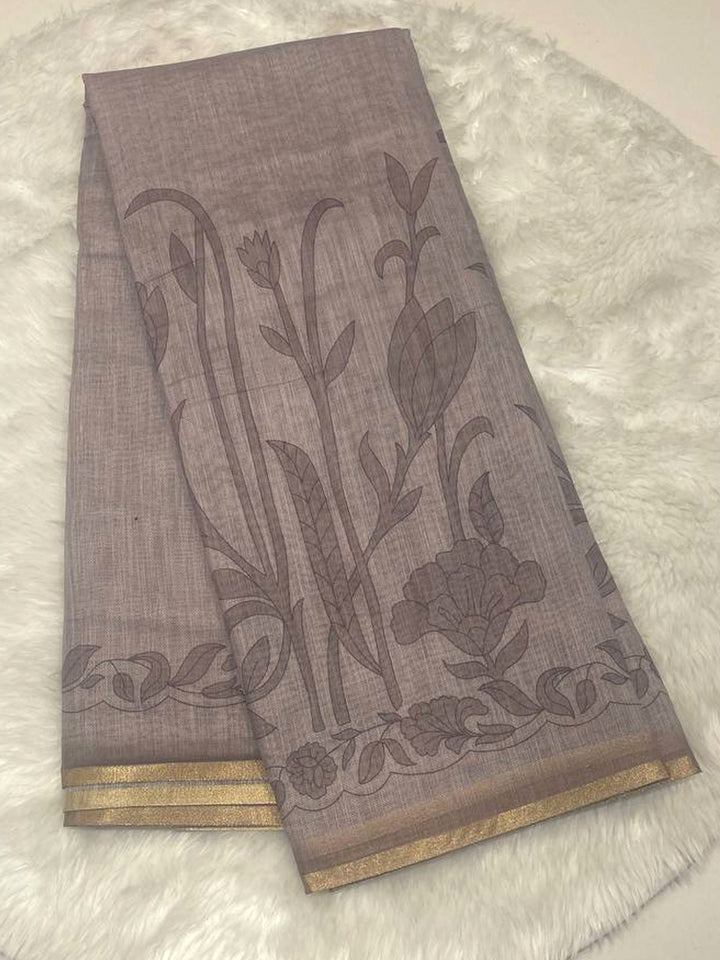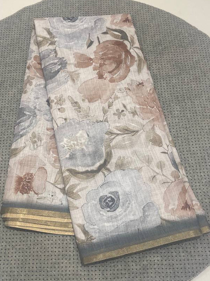 "Earthy Bloom" Digital Linen Saree. Luxurious brown linen with a vibrant, large-scale digital floral print in hues of pink, lavender, and teal. It features a fine gold zari line border and includes a matching self-blouse piece. Lightweight, breathable, and perfect for an effortlessly chic look.