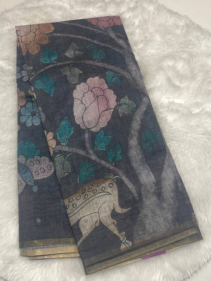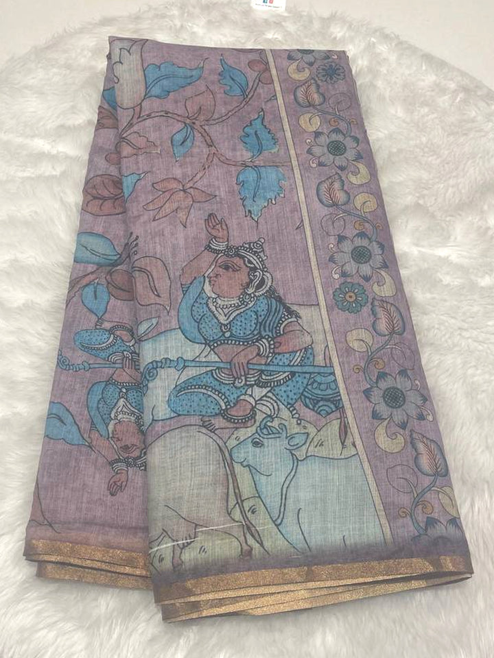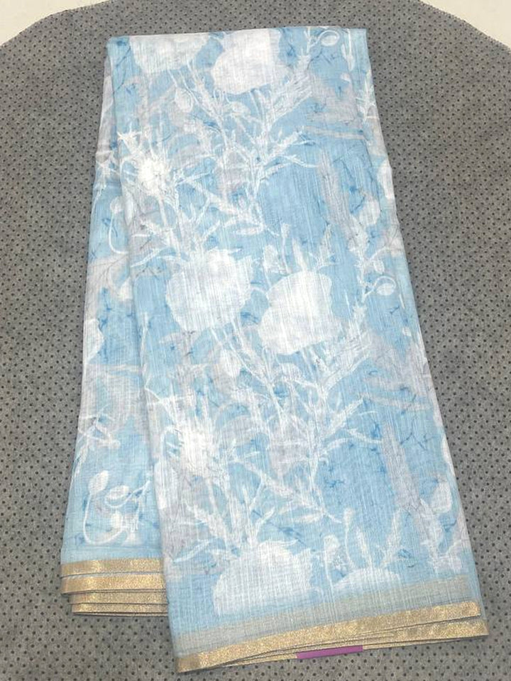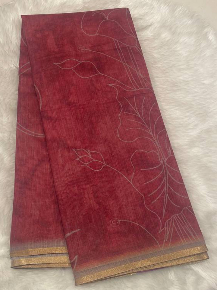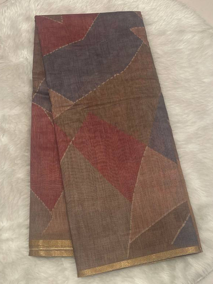"Earthy Bloom" Digital Linen Saree. Luxurious brown linen with a vibrant, large-scale digital floral print in hues of pink, lavender, and teal. It features a fine gold zari line border and includes a matching self-blouse piece. Lightweight, breathable, and perfect for an effortlessly chic look.