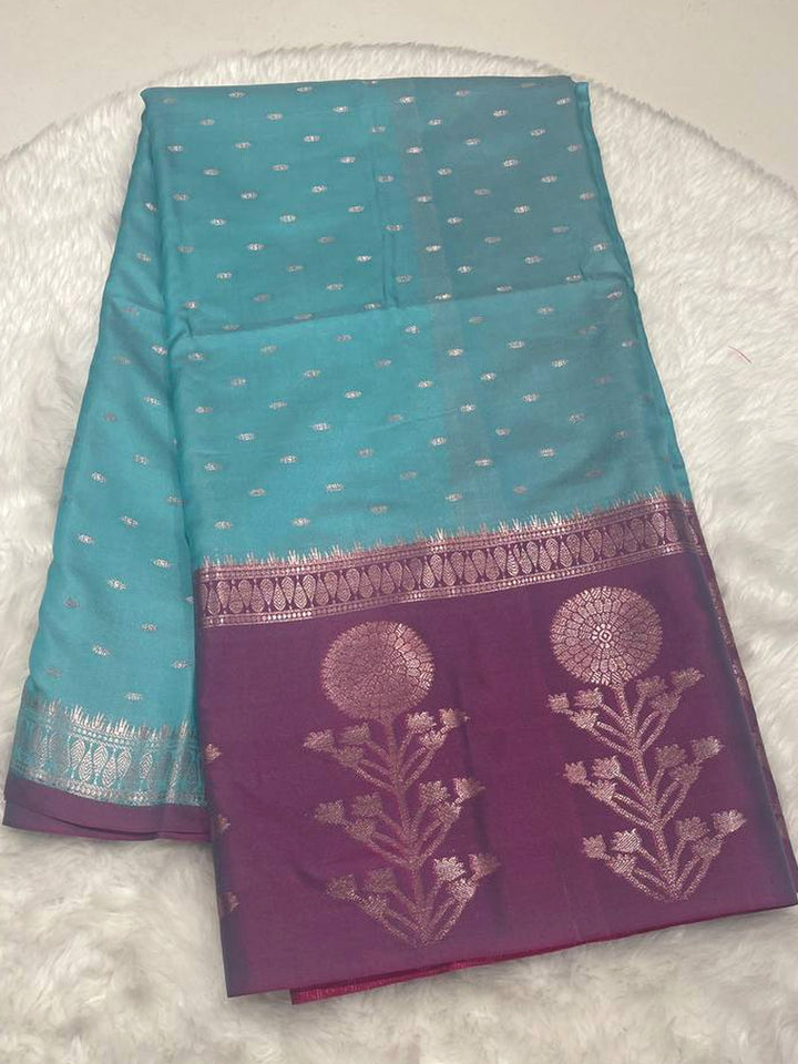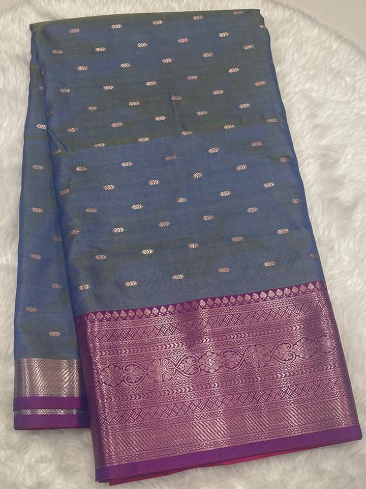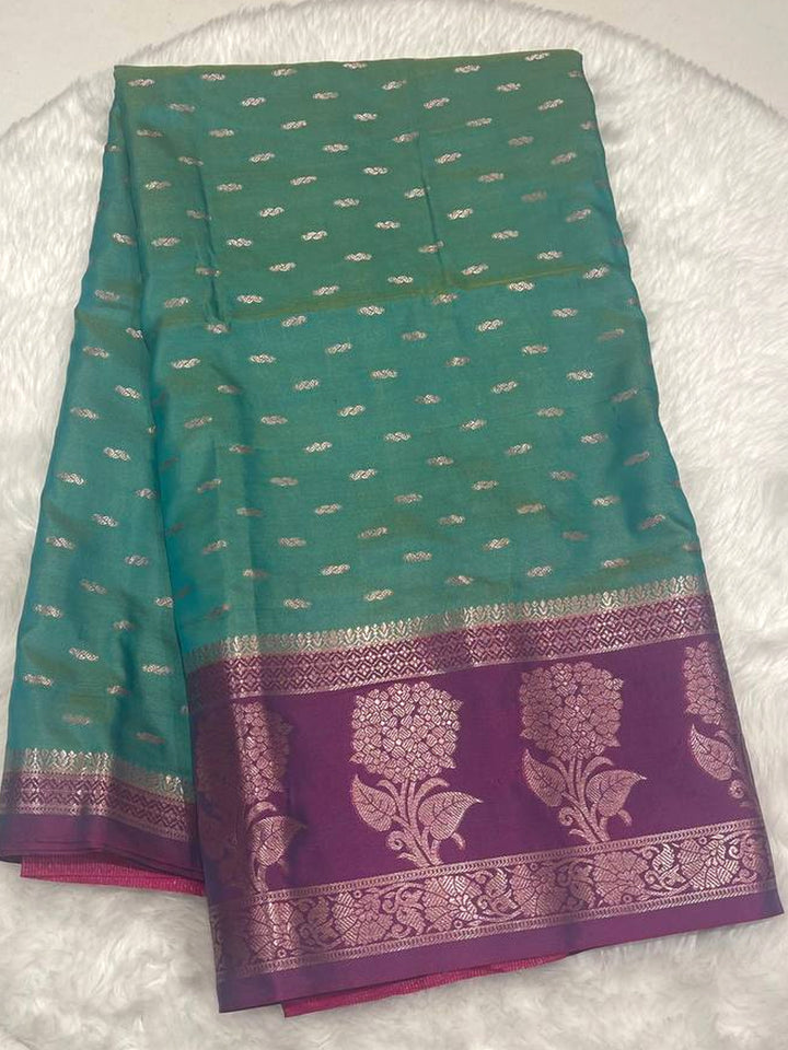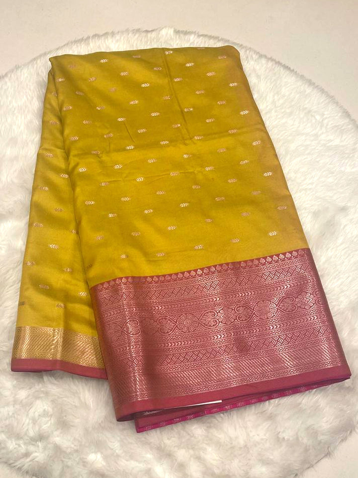 An elegant Dupiana Silk saree in a rich mustard yellow/gold shade. The body is subtly adorned with delicate, all-over woven small zari butas (motifs). The saree is dramatically defined by a broad, elaborate contrast border in a rich rani pink/magenta color, featuring traditional woven patterns. Includes a matching contrast blouse piece to complete the vibrant look.