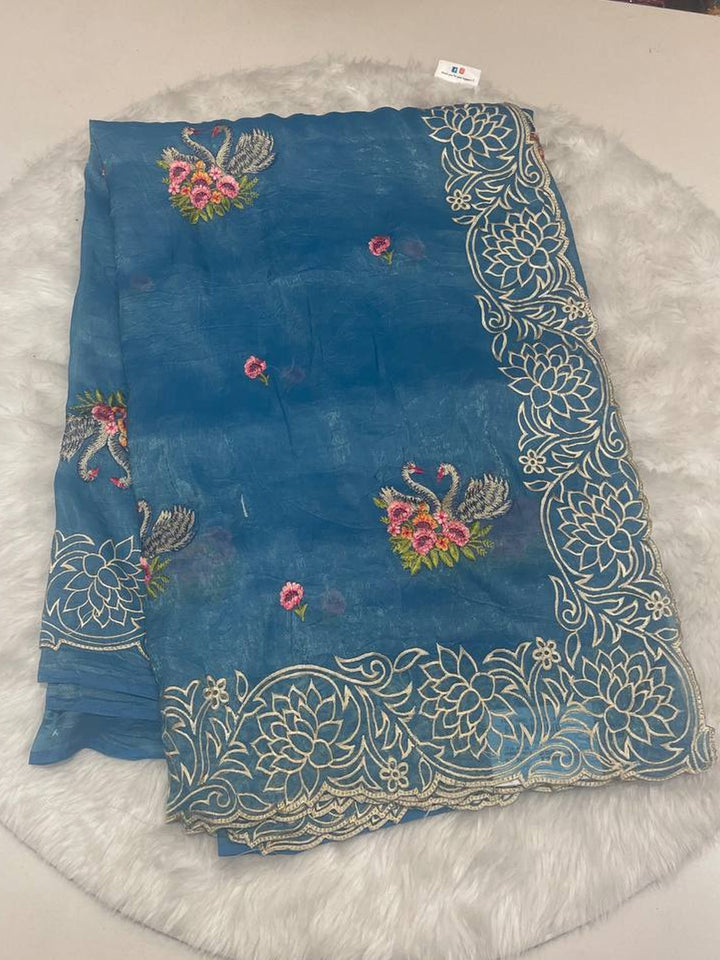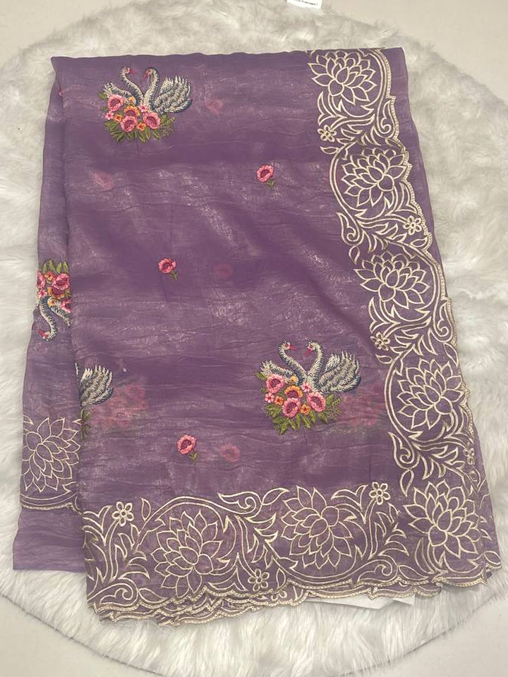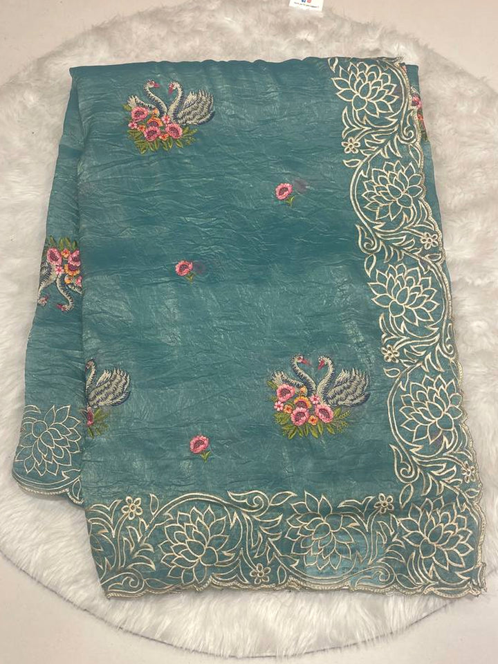 An enchanting space silk saree showcasing exquisite craftsmanship. The body is adorned with beautiful multicolor thread-embroidered swan and floral motifs. The highlight is the wide, intricate cut-work border featuring bold lotus and vine patterns. Includes a running blouse piece.