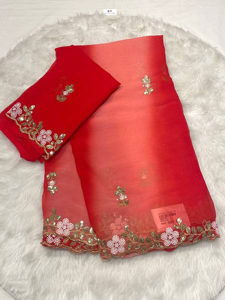 This Georgette saree exudes sophistication with its stunning multi-dye ombre transitioning from lavender to deep violet. Adorned with delicate sequence detailing and a contrasting thread work cut-work border highlighted by shimmering gold accents, it offers a refined aesthetic ideal for evening occasions. The lightweight, flowy fabric ensures graceful draping, complemented by a designer blouse piece featuring heavy border embellishments. For lasting beauty, professional dry cleaning is recommended.