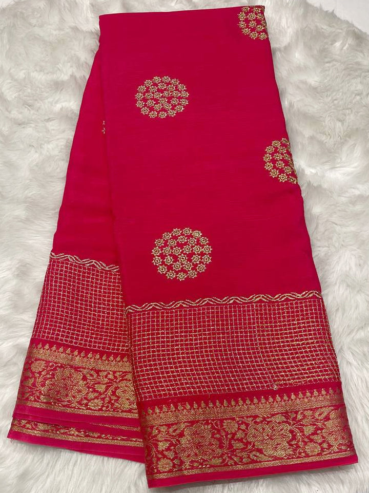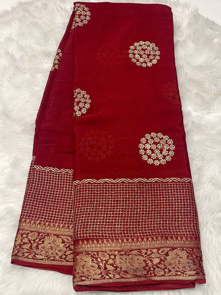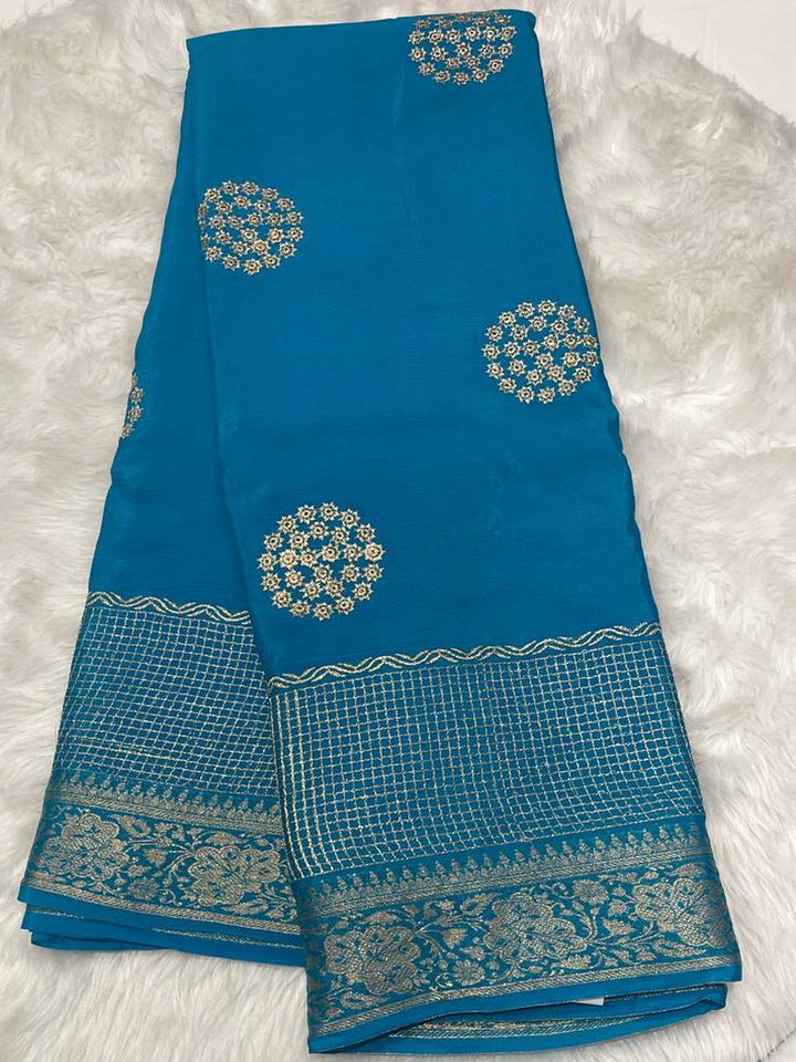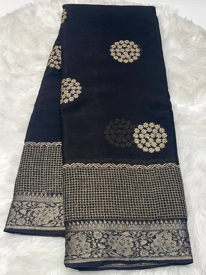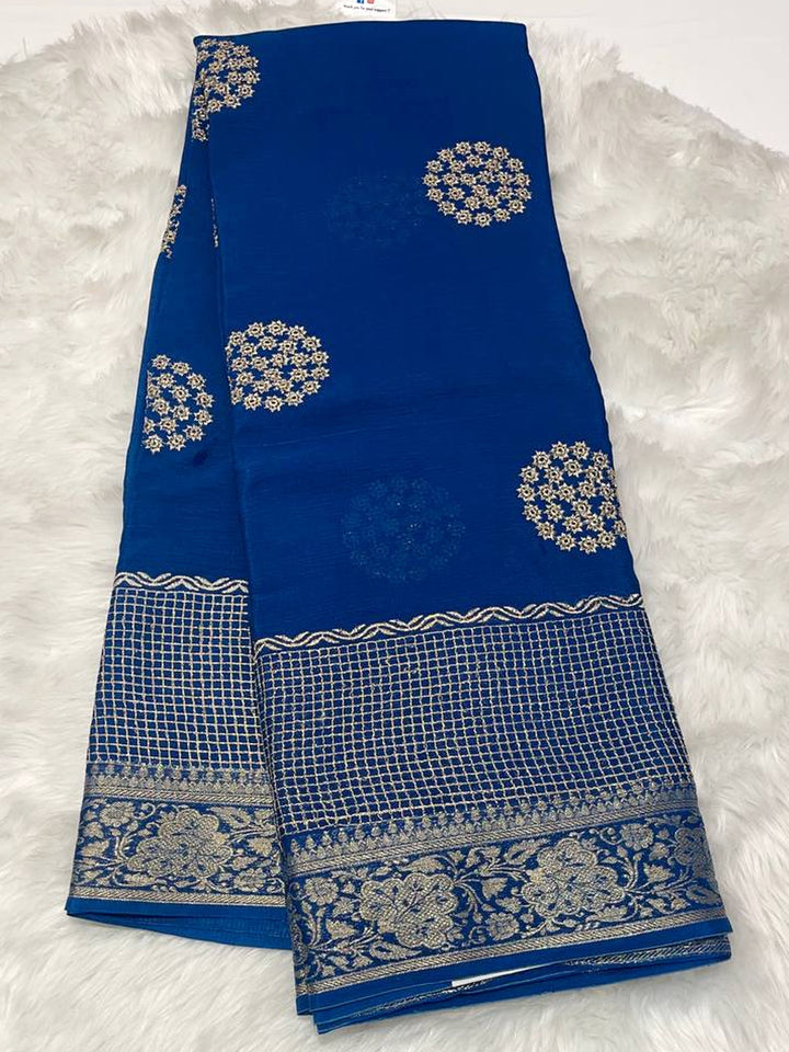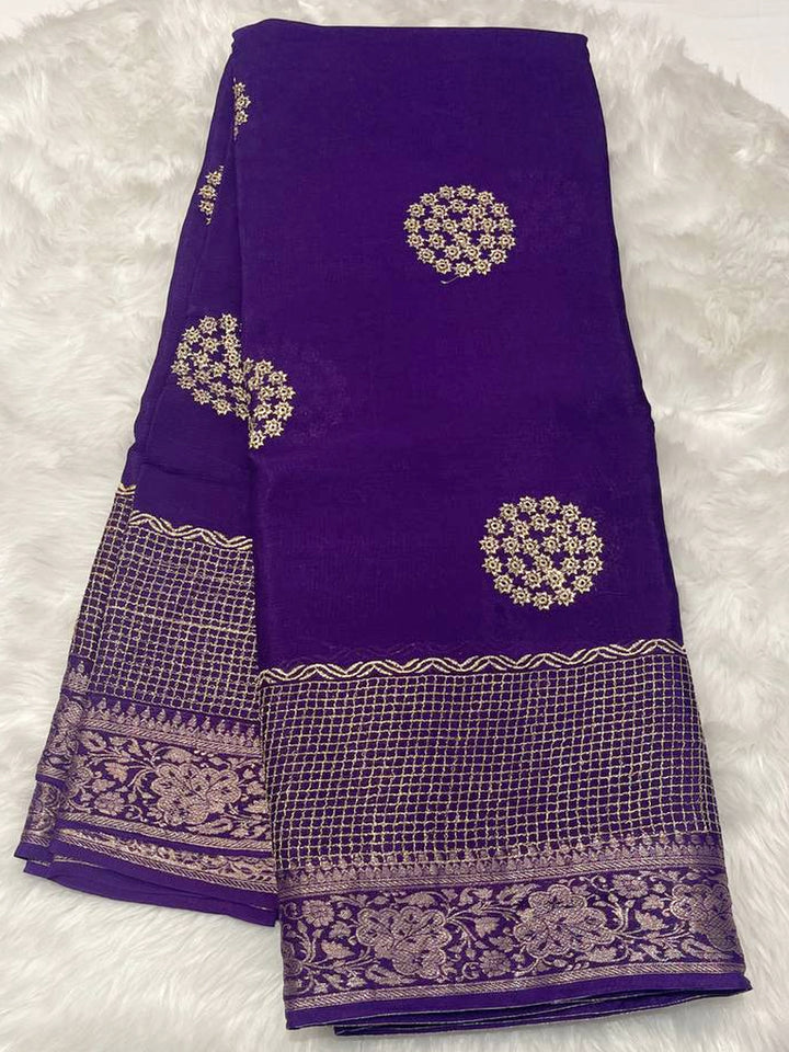 Embrace luxury with this gorgeous Georgette Crape saree. It features intricate gold zari work booties all over and a heavy zari woven border and pallu. The flowy, elegant texture makes it perfect for evening festive or party events. It comes with a matching self blouse piece. Dry clean only.