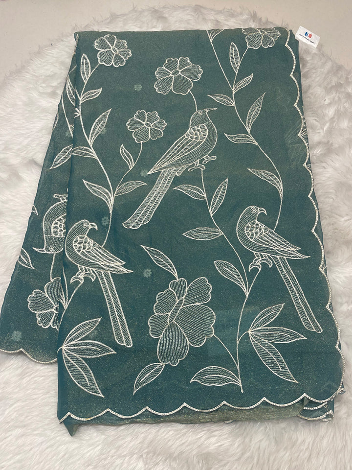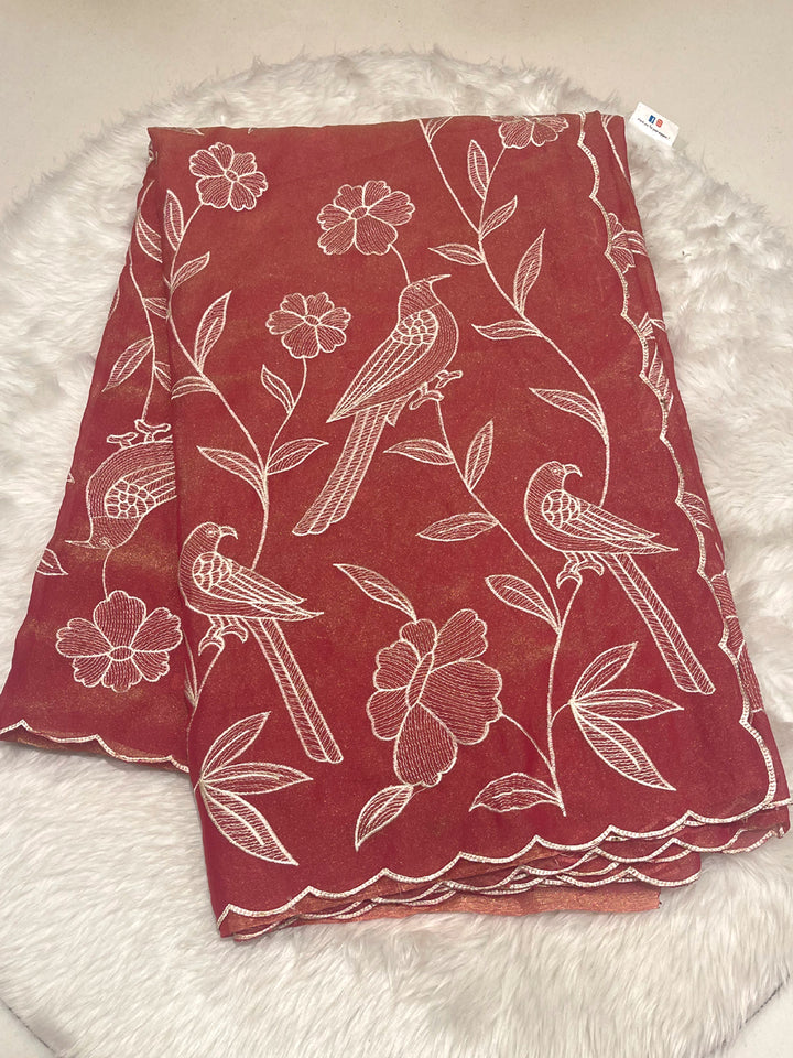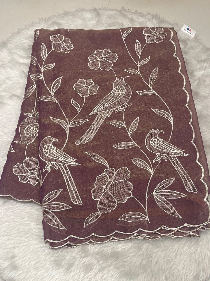 This exquisite Malai Georgette saree in a lustrous copper-brown or rustic gold hue offers a soft, flowing silhouette ideal for elegant occasions. Its body features intricate white thread embroidery showcasing large parrot motifs amid delicate floral and vine patterns, demonstrating skilled craftsmanship. The scalloped cut-work border adds a distinctive finishing touch, enhancing the saree's refined appeal. Included is a matching self-blouse piece, providing a seamless ensemble that balances tradition with sophistication. Perfect for those seeking a graceful yet striking ethnic wardrobe addition.
