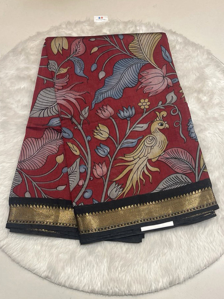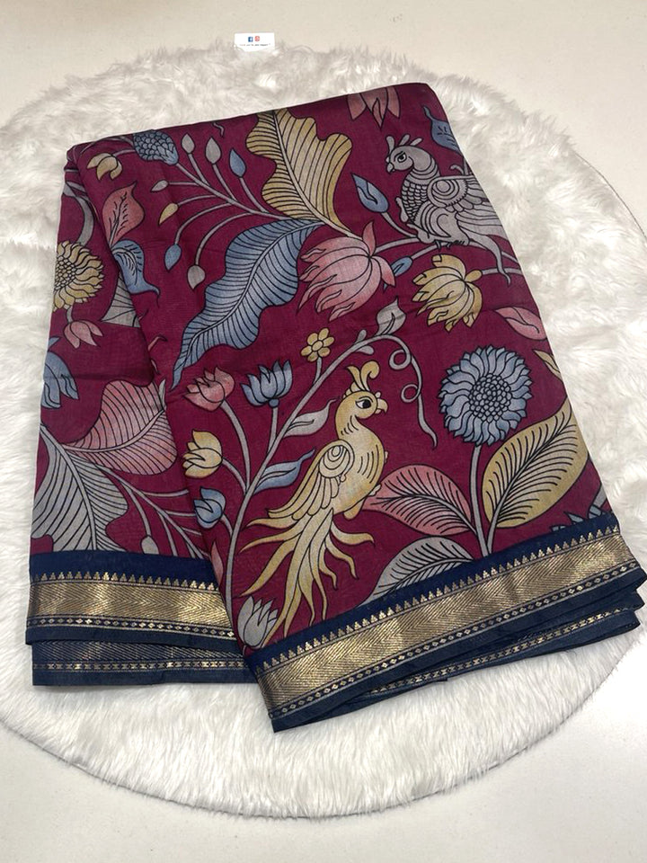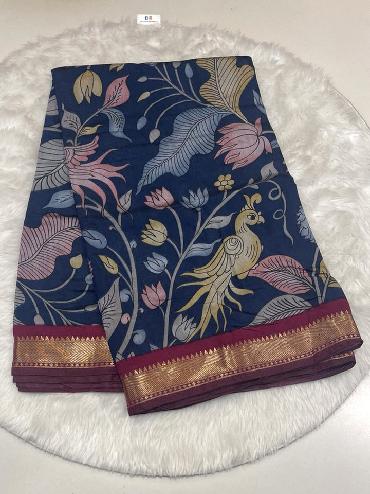 These soft, lightweight Malmal Cotton Sarees feature a rich, all-over Kalamkari-style print with vibrant floral and traditional bird motifs set against deep base colors (Olive Green, Navy Blue, Maroon, Red). Each saree is finished with a traditional contrast small zari border. It is paired with a matching contrast Bandhani-design blouse piece, offering a perfect blend of comfort, traditional artistry, and striking color contrast for daily or casual festive wear.