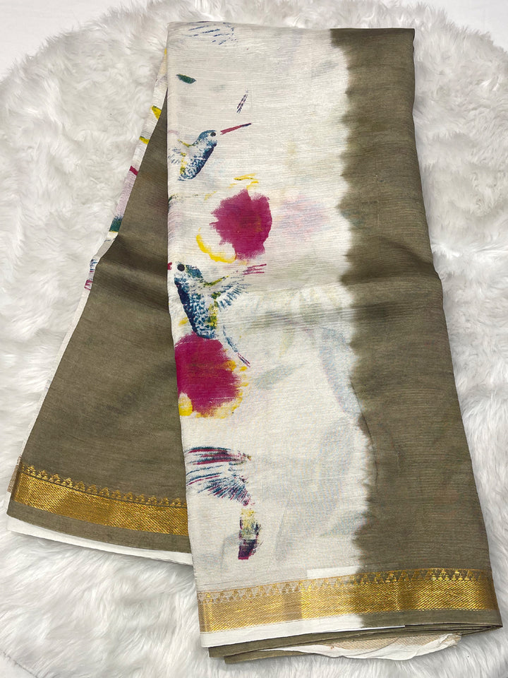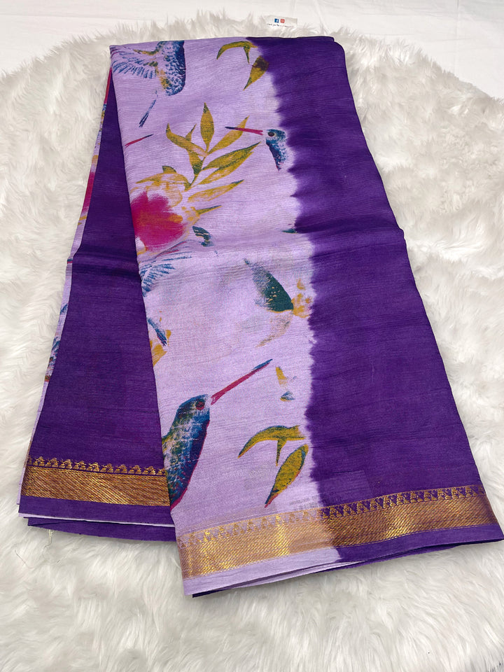 Vibrant Mangalagiri saree in a captivating half-and-half style, featuring intricate hand-printed birds and florals and a rich ruby red body. Finished with a delicate small gold zari border. The elegant texture and handloom feel make it perfect for daytime events. It comes with a contrast blouse piece. Dry clean only.