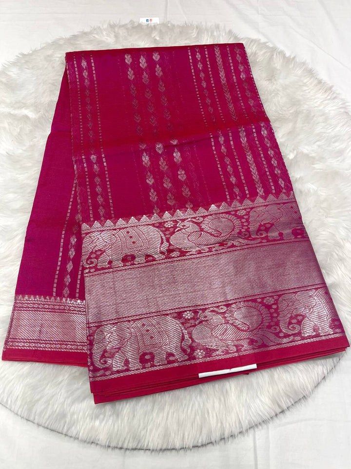 Showcase heritage with this gorgeous Radiant Orange Mangalagiri saree. It features delicate silver stripe weaving and butta all over the body, complemented by a rich self-zari border with intricate elephant and peacock motifs. The classic handloom texture is perfect for traditional events. It comes with a matching plain self blouse piece. Dry clean only.