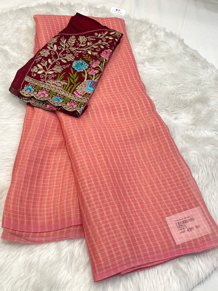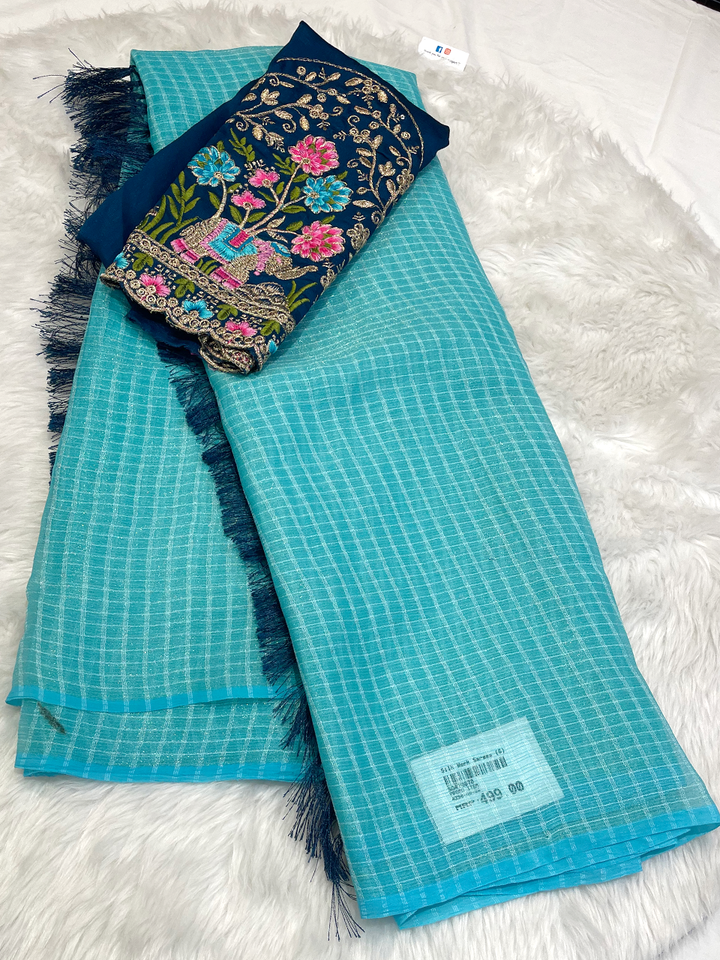 A refreshing Masakkali Checks Saree in light Mint Green with a subtle shimmer. The simple, elegant body is beautifully contrasted by a vibrant Dark Green work blouse, featuring rich multi-color embroidery of birds and flowers. A chic choice for day or evening events.
