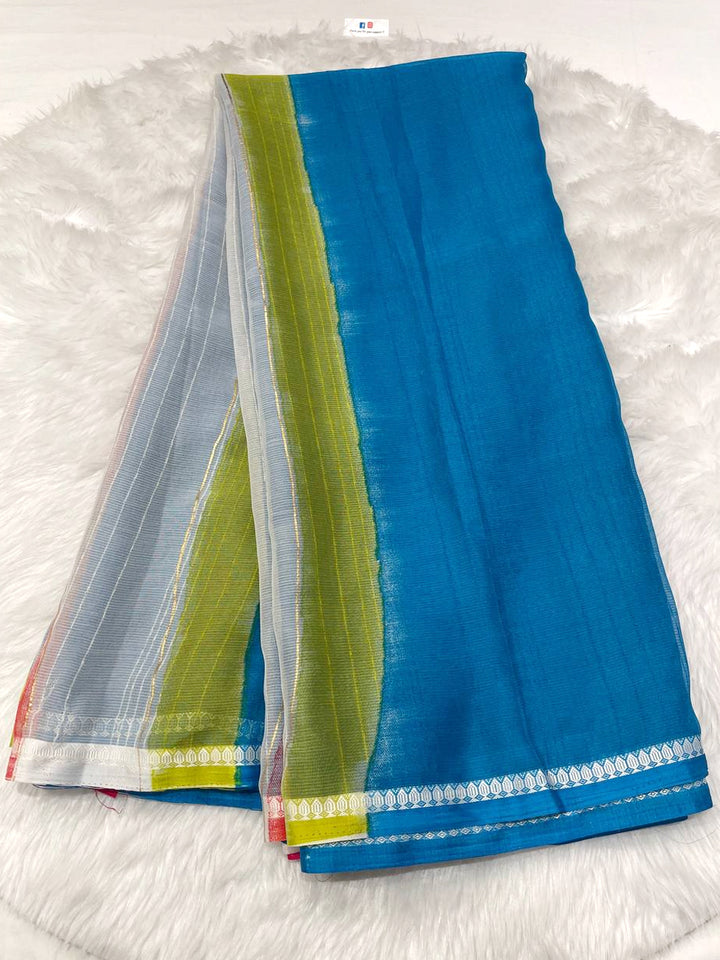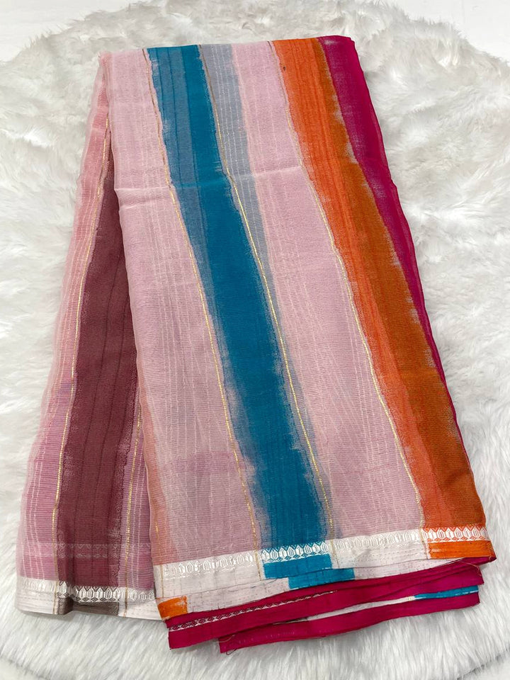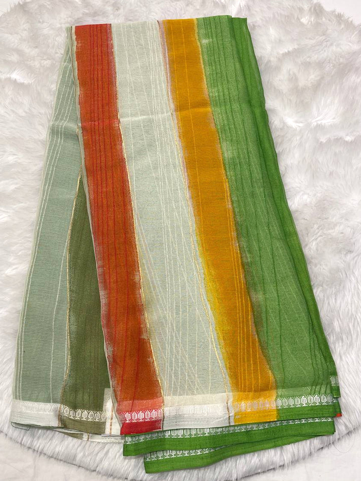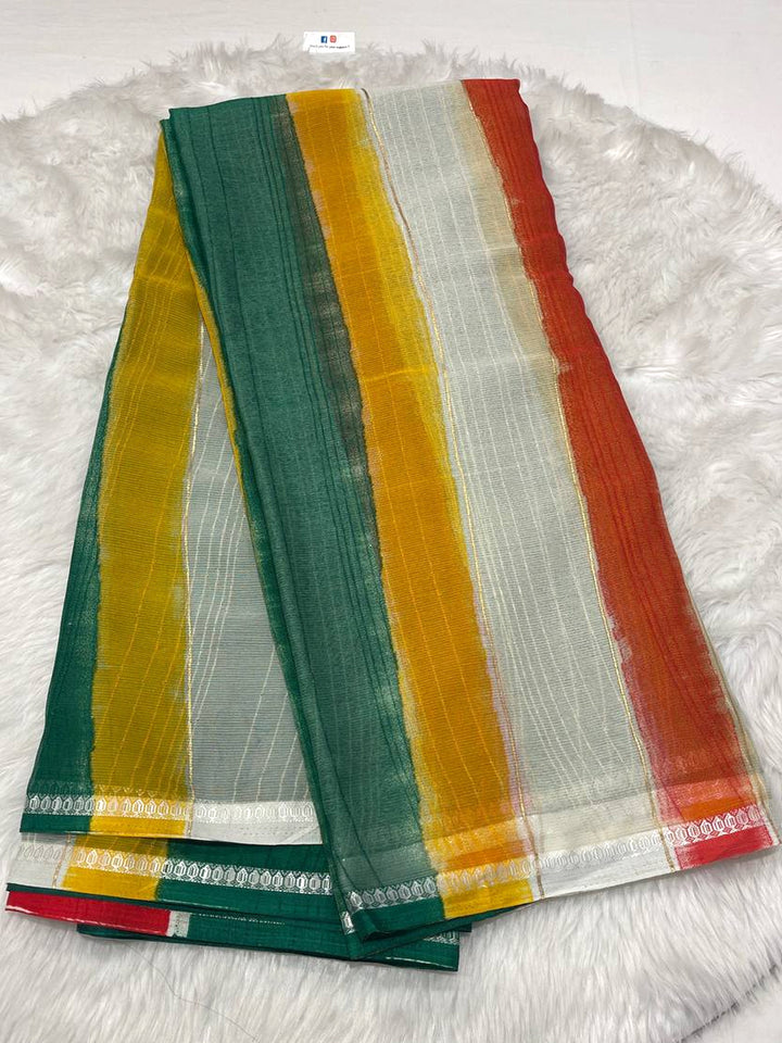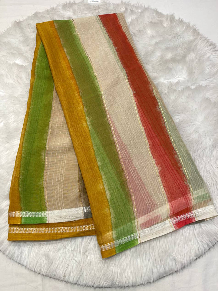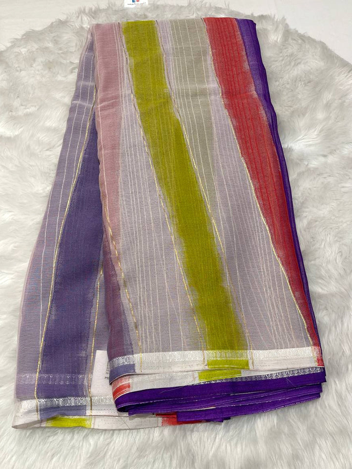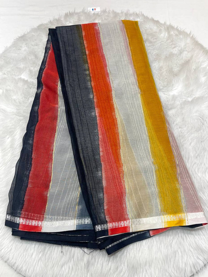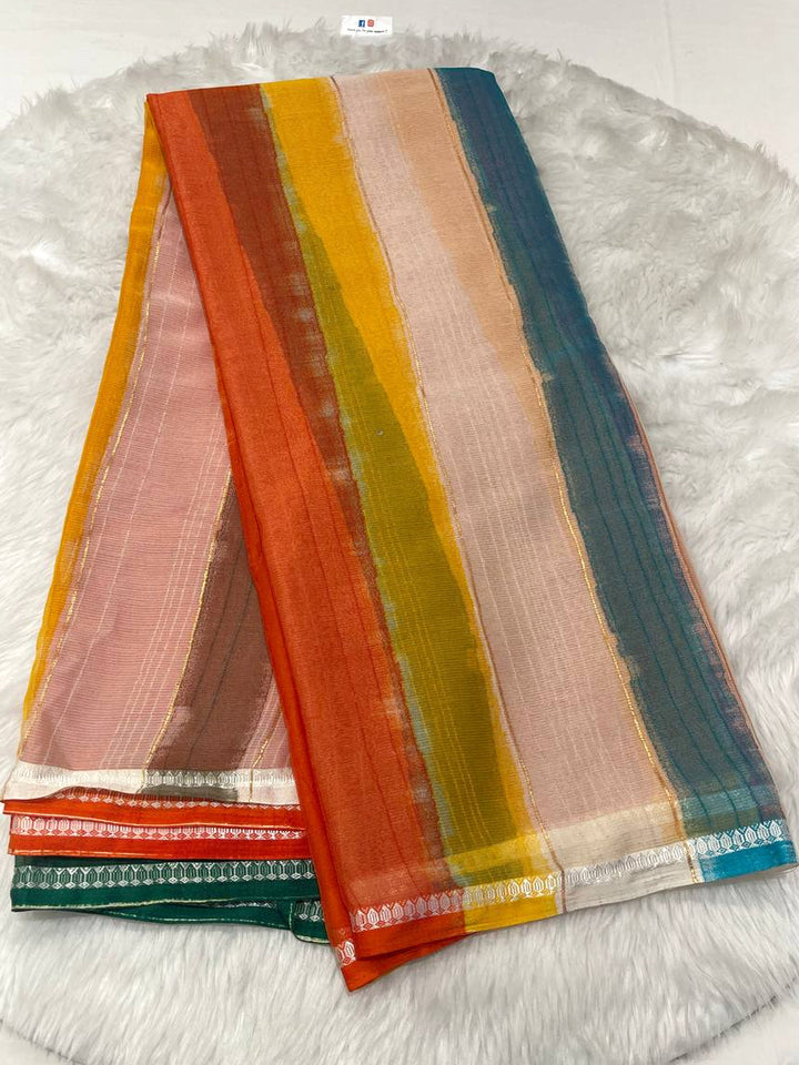 Embrace modern style with this gorgeous Chiffon saree. It features striking rainbow-like stripes in vibrant hues like red, black, yellow, and white, enhanced by subtle thread weaving throughout the body. The sheer, lightweight texture makes it perfect for contemporary events. It comes with a matching contrast blouse piece. Dry clean only.