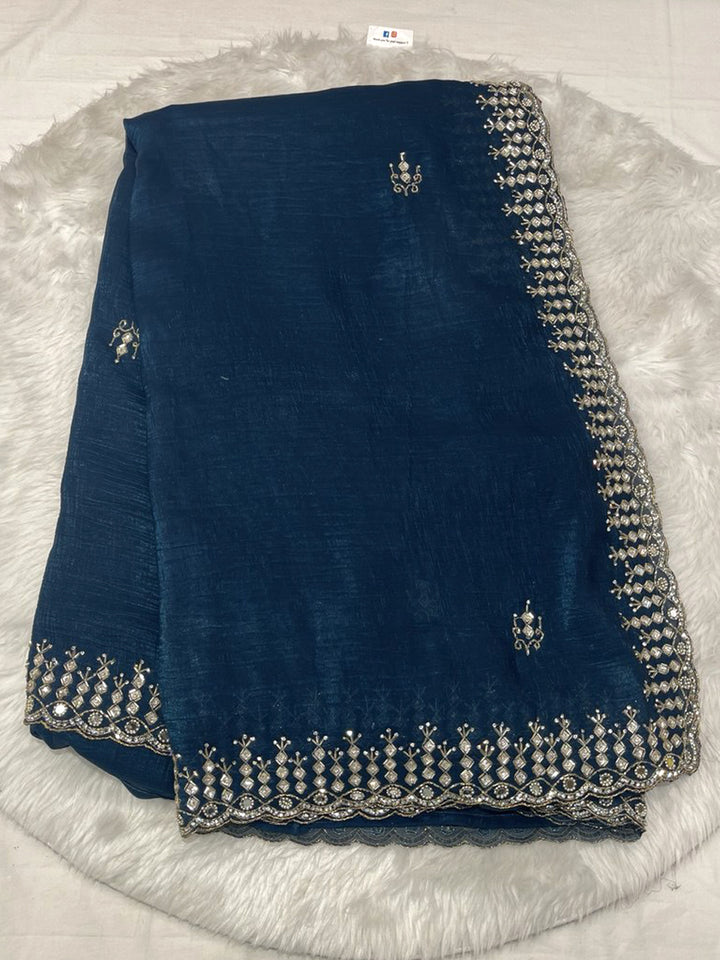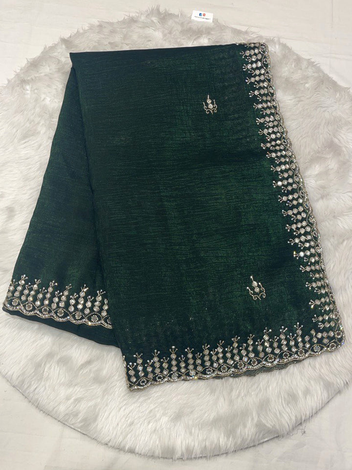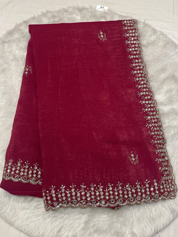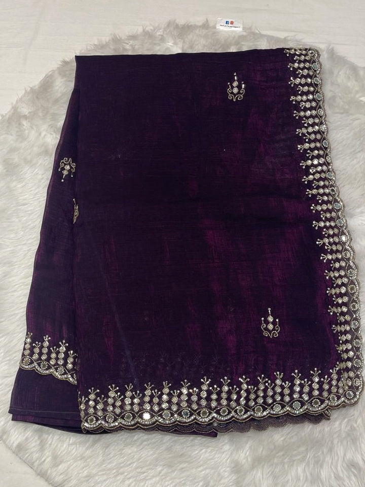 An opulent Maska Silk saree in a rich, dark plum/wine purple shade, featuring a luxurious velvet-like texture. The body is subtly adorned with scattered small Kardhana and stone work motifs. The highlight is the extravagant, scalloped mirror work border (round and oval shapes) embellished with Kardhana and silver thread work, providing a breathtaking sparkle. Includes a matching self-work blouse piece with complementary work detailing.