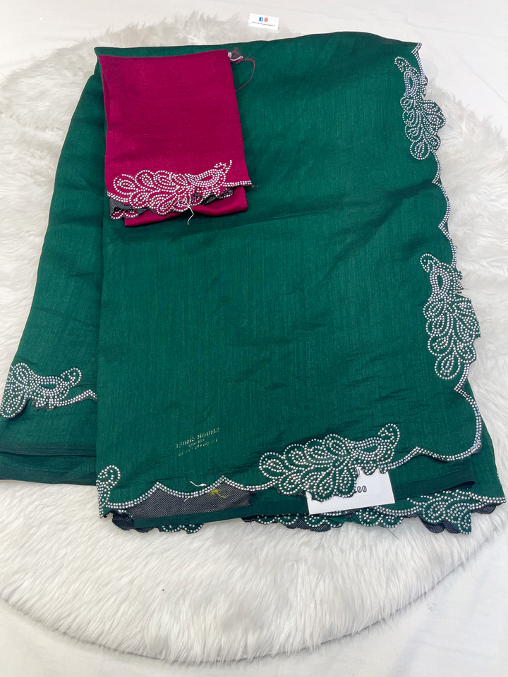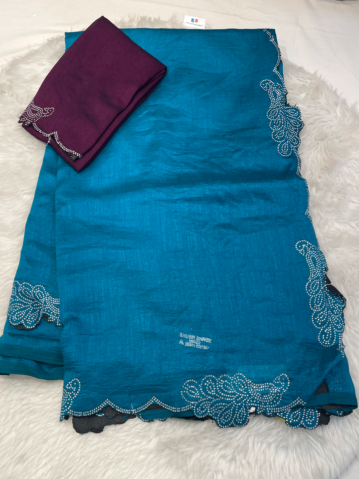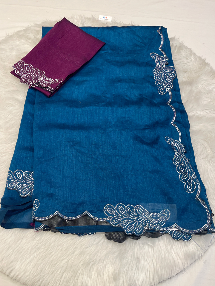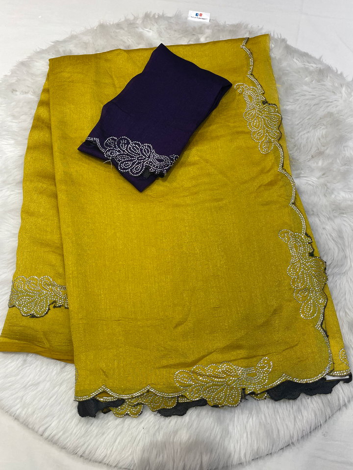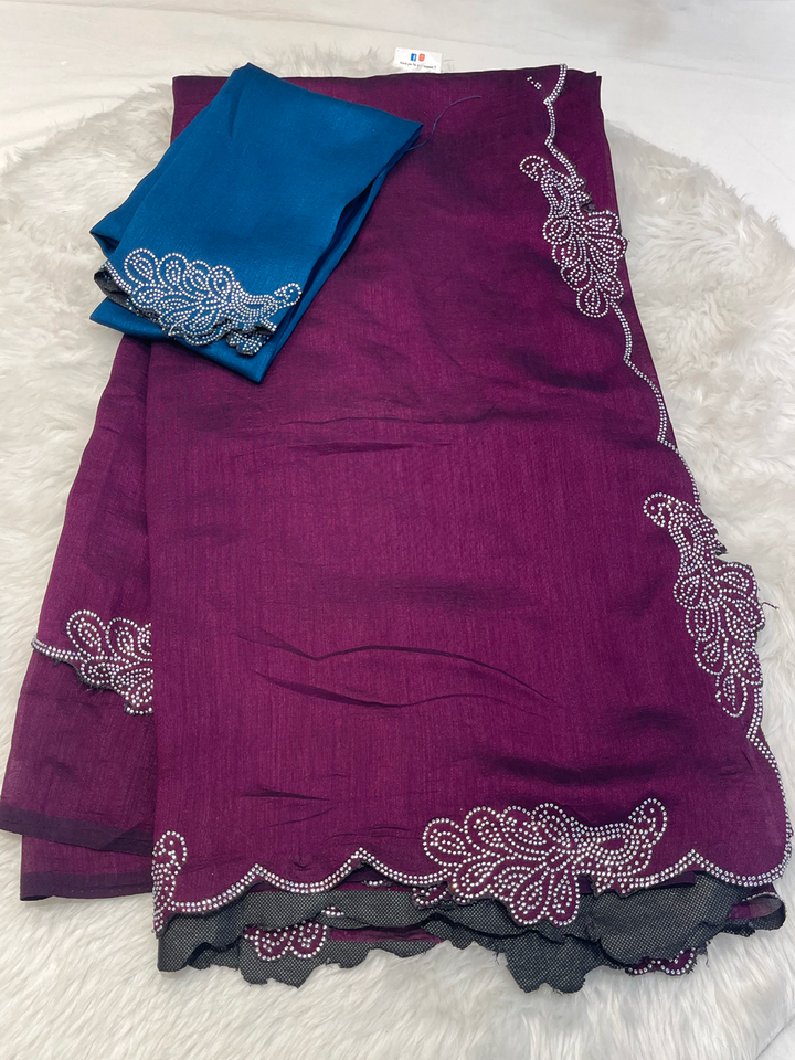A luxurious Plum Malbari Georgette Saree featuring a striking scalloped border with intricate crystal stone work. The rich purple body is perfectly contrasted by a Golden Yellow blouse piece, making it an exquisite choice for evening wear and celebrations. Comes with a contrast blouse.
