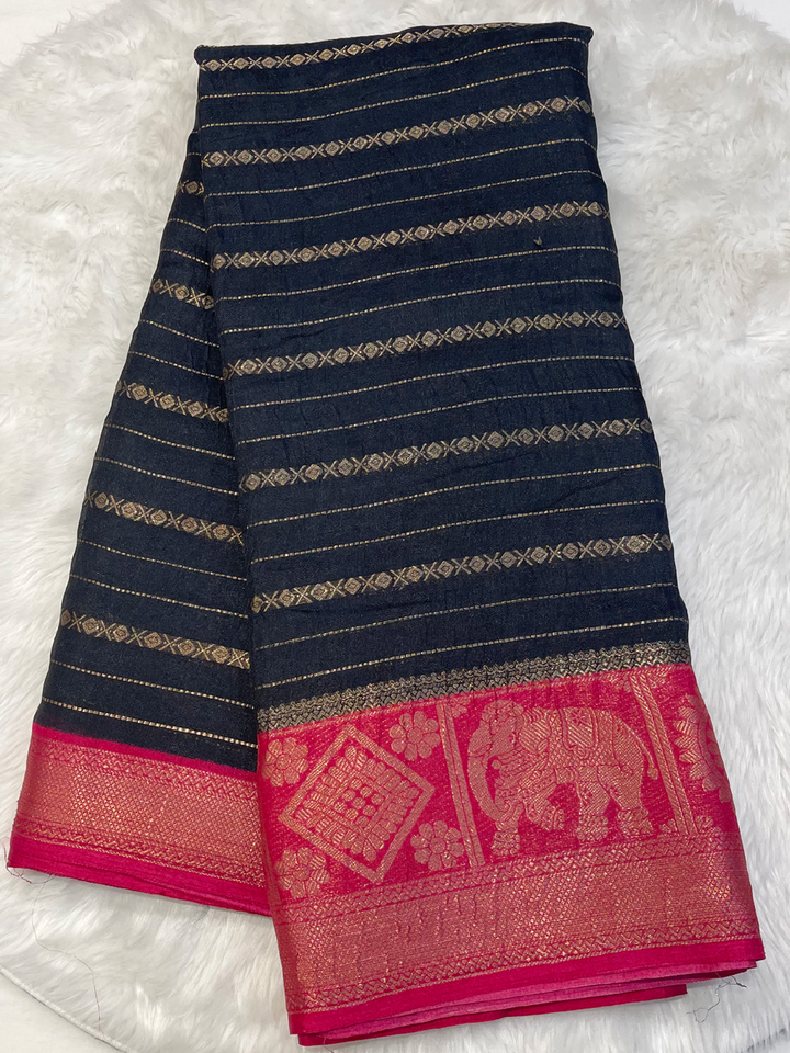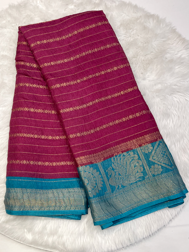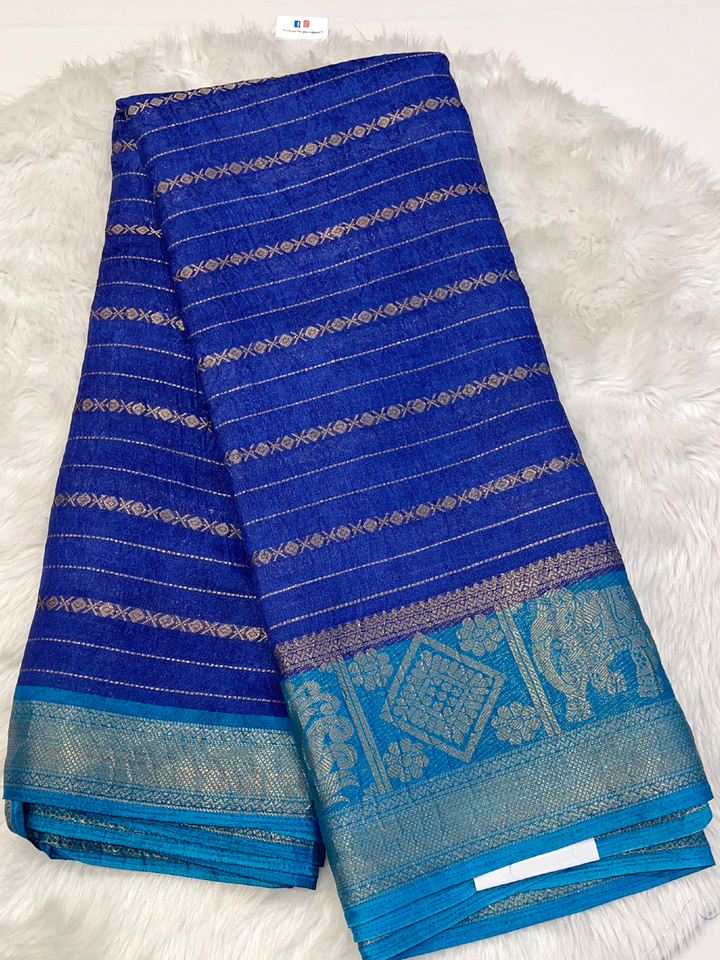Experience elegance with this Super Hit Sarayu Silk Saree. Its rich Teal body shimmers with intricate gold zari horizontal stripes and subtle motifs, beautifully complemented by a broad, radiant Golden Yellow contrast border and pallu. Perfect for festive charm. Includes contrast blouse.
