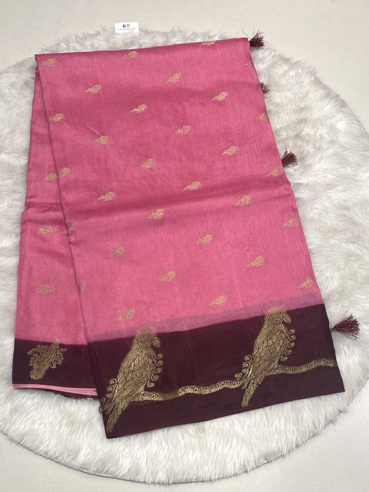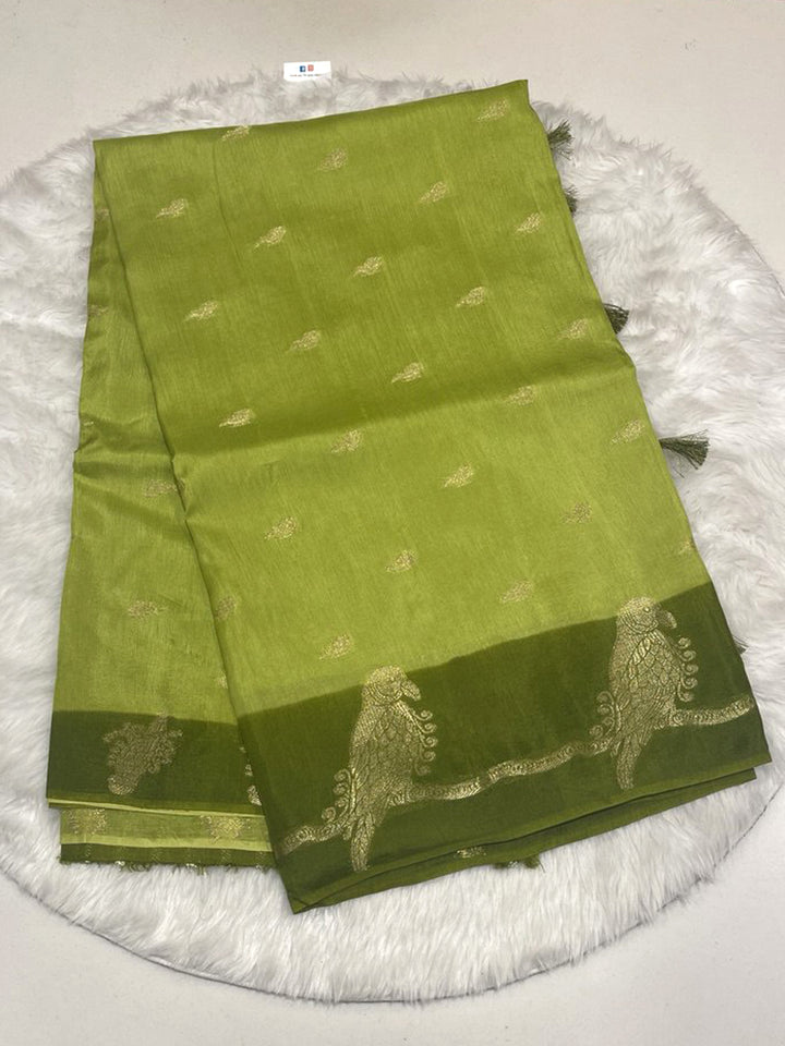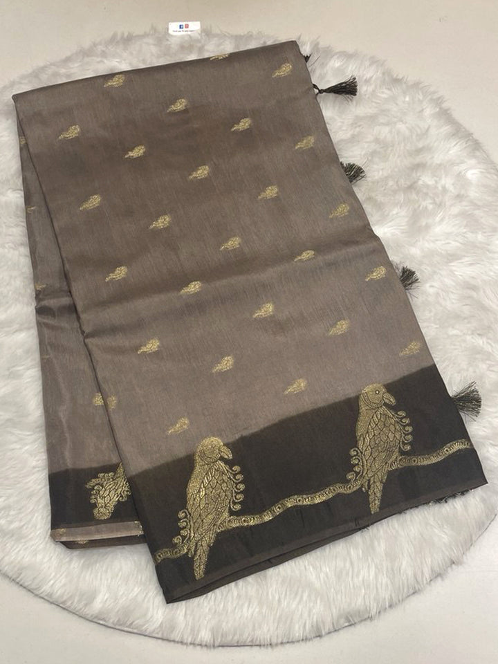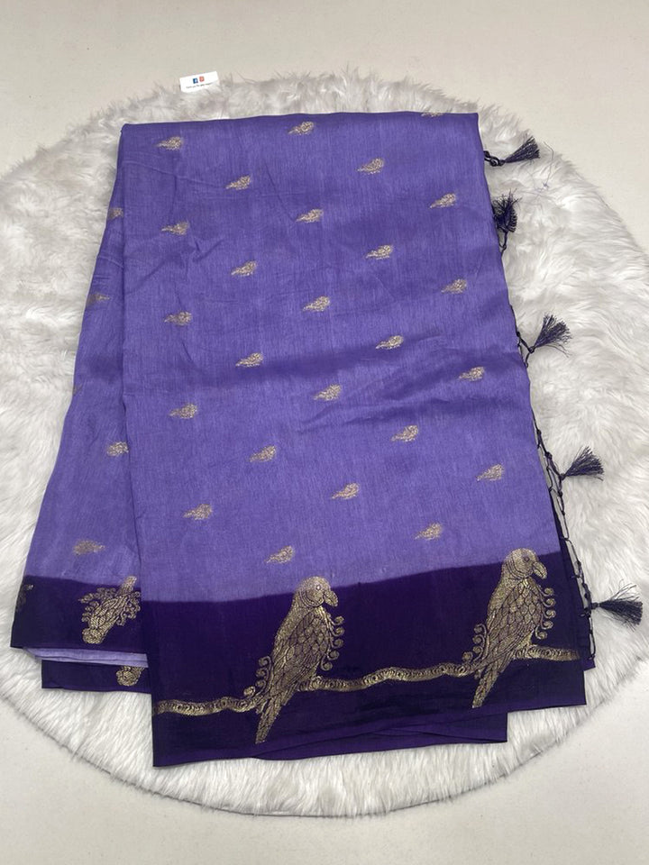These elegant Semi Tussar Sarees feature a classic, smooth drape in gorgeous colors (Green, Purple, Brown, Pink). The body is scattered with woven gold zari parrot butas. The defining feature is the wide contrast border with an elaborate gold zari weaving of large parrot motifs resting on a branch. The saree includes a self-plain blouse piece with complementary small butas. A perfect blend of traditional Tussar texture and vibrant, modern design.