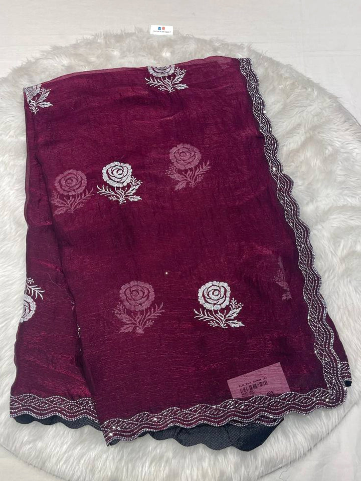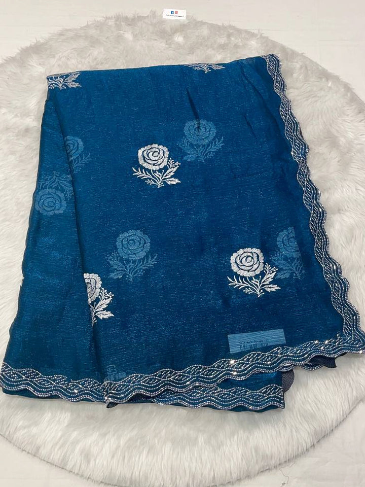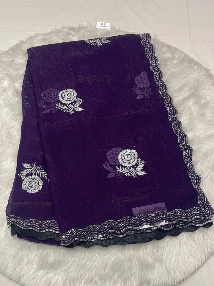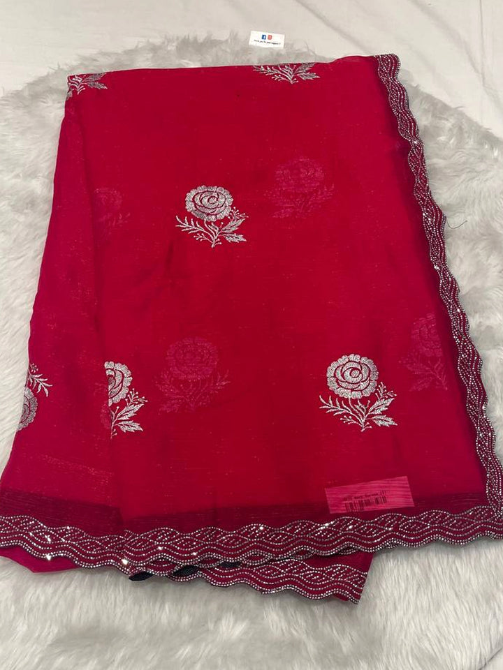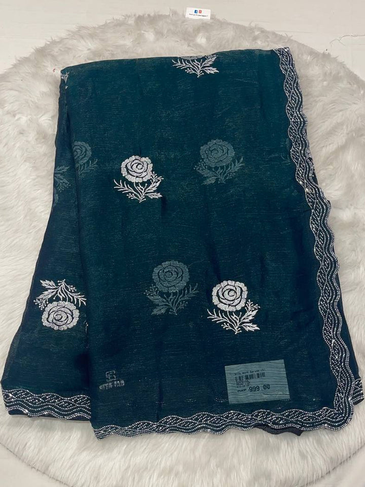 exquisite Silky Chiffon saree in a deep, rich bottle green shade, offering an incredibly soft and elegant drape. The body features beautiful, scattered silver zari and thread work motifs of large roses and sprigs, with some motifs subtly visible in a self-color weave (Turner work). The border is the highlight, with a striking scalloped design heavily embellished with continuous silver zari and stone work, creating a luxurious, sparkling finish. Includes a matching self-blouse piece.