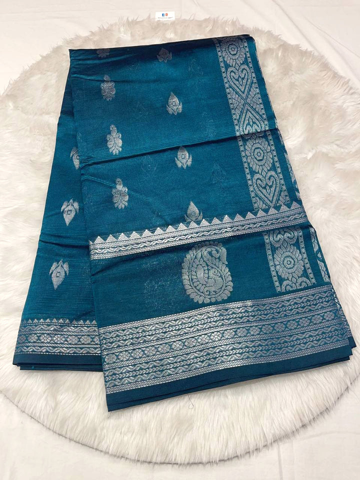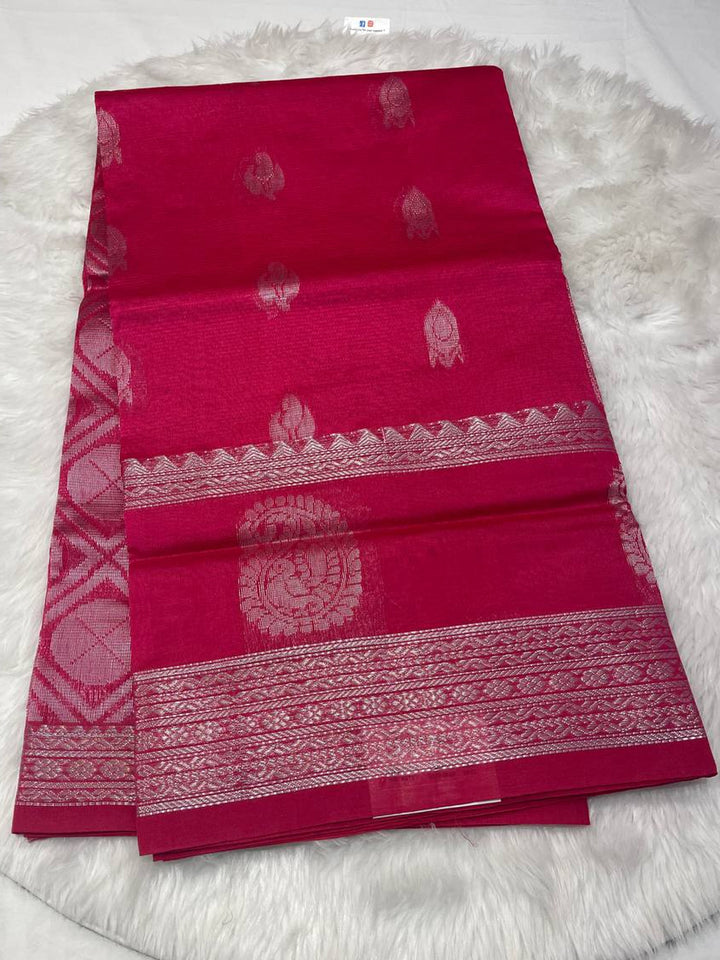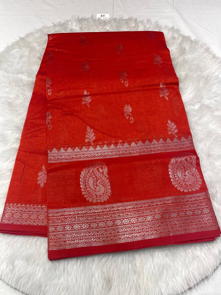 Embrace tradition with this gorgeous Vermillion Red Guwahati Pattu saree. It features delicate silver buta weaving across the body and a striking step border with rich silver weaving and peacock motifs. The rich texture makes it perfect for festive or wedding events. It comes with a matching self blouse piece. Dry clean only.