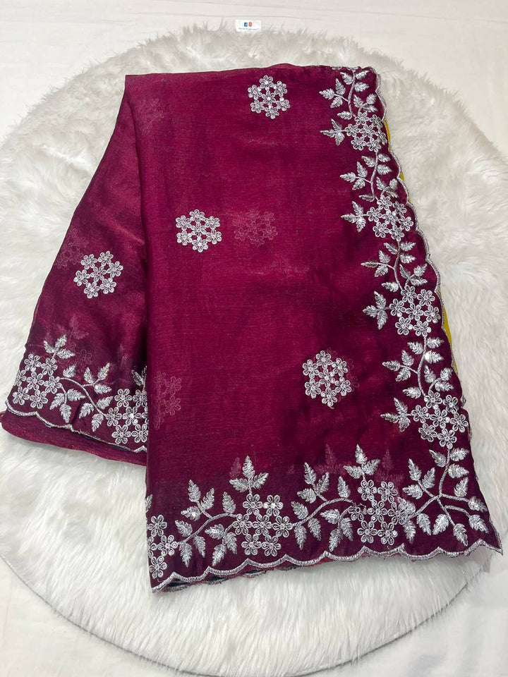 Embrace glamour with this gorgeous Raspberry Red Space Silk saree. It features delicate silver design booties woven throughout the body and an exquisite, heavy silver cut-work border. The rich texture and elegant detailing make it perfect for any party or wedding event. It comes with a matching self blouse piece. Dry clean only.