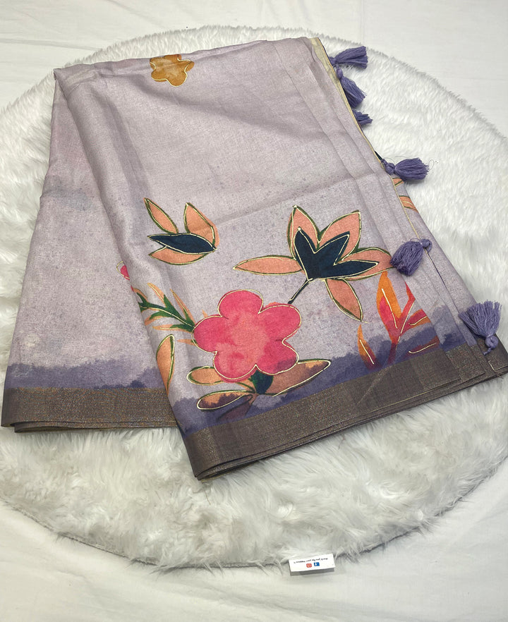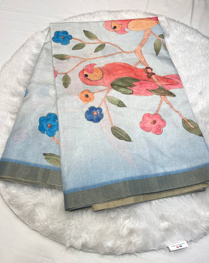 Embrace artisanal charm with this exquisite Khadi Fancy Silk saree in soft sky blue. It features a unique Digital Hand Print of artistic birds and flowers, giving it a watercolor effect. The simple zari border adds subtle elegance. Complete with a contrast printed blouse, this piece is perfect for contemporary festive wear or art events. Hand wash or dry clean.