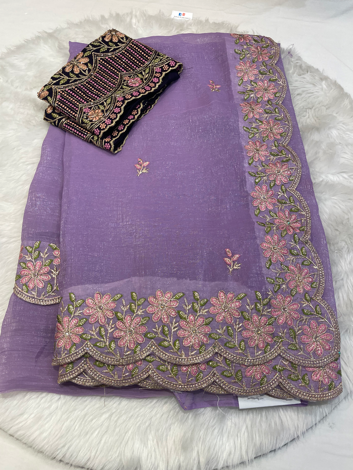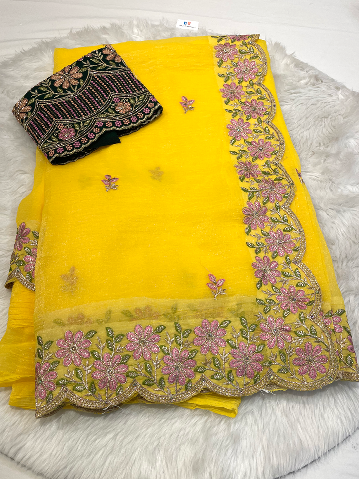 Step out in style with this elegant Fendy Tissue Saree in luminous Lime Green. It features a stunning scalloped border with rich pink and gold threadwork embroidery. The striking Black contrast work blouse with intricate stitching completes this festive and modern look.